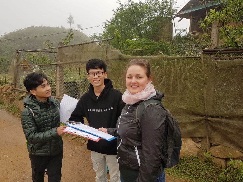 In der Hand mit unseren zuvor erstellten Bewertungsbögen für die Ortsanalyse starteten wir unsere Wandertour. Diese erfolgte in Partnerarbeit von jeweils einem deutschen und einem vietnamesischen Studenten. Die anfängliche Schüchternheit der Vietnamesen war verflogen und wir haben so einiges austauschen können. Es ist schon sehr interessant wie unterschiedlich das Studentenleben in einem anderen Land ist und was die jungen Vietnamesen für Wünsche haben.Wie versprochen warteten auch die gleichen Frauen an unserem Startpunkt, die wir bereits vor unserem Hotel in Sa Pa kennengelernt hatten. Sie begleiteten uns während der gesamten Wanderung und erzählten uns viel über die Region, ihr Leben und hatten auch großes Interesse an unserem. Auch hier bemerkten wir wieder die kulturellen Unterschiede, denn die Distanzverhältnisse waren minimal. Erneut kamen uns die Vietnamesen sehr nahe und berührten uns häufig am Arm. Es war ein schmaler Grat zwischen Freundlichkeit und Aufdringlichkeit.