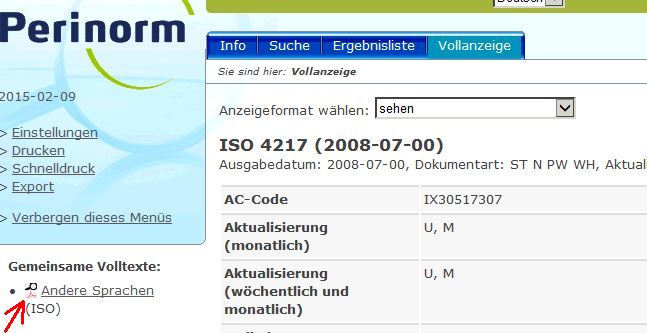 Seit kurzem sind aktuell gültige ISO-Normen im Volltext in der Datenbank Perinorm (DIN-. VDI- sowie ISO-Volltexte) verfügbar. Zu erkennen sind die elektronischen Volltexte am PDF-Zeichen, dass vor der Norm in der Ergebnisliste erscheint.