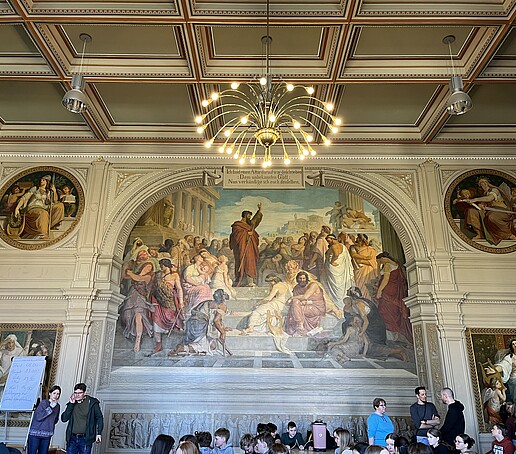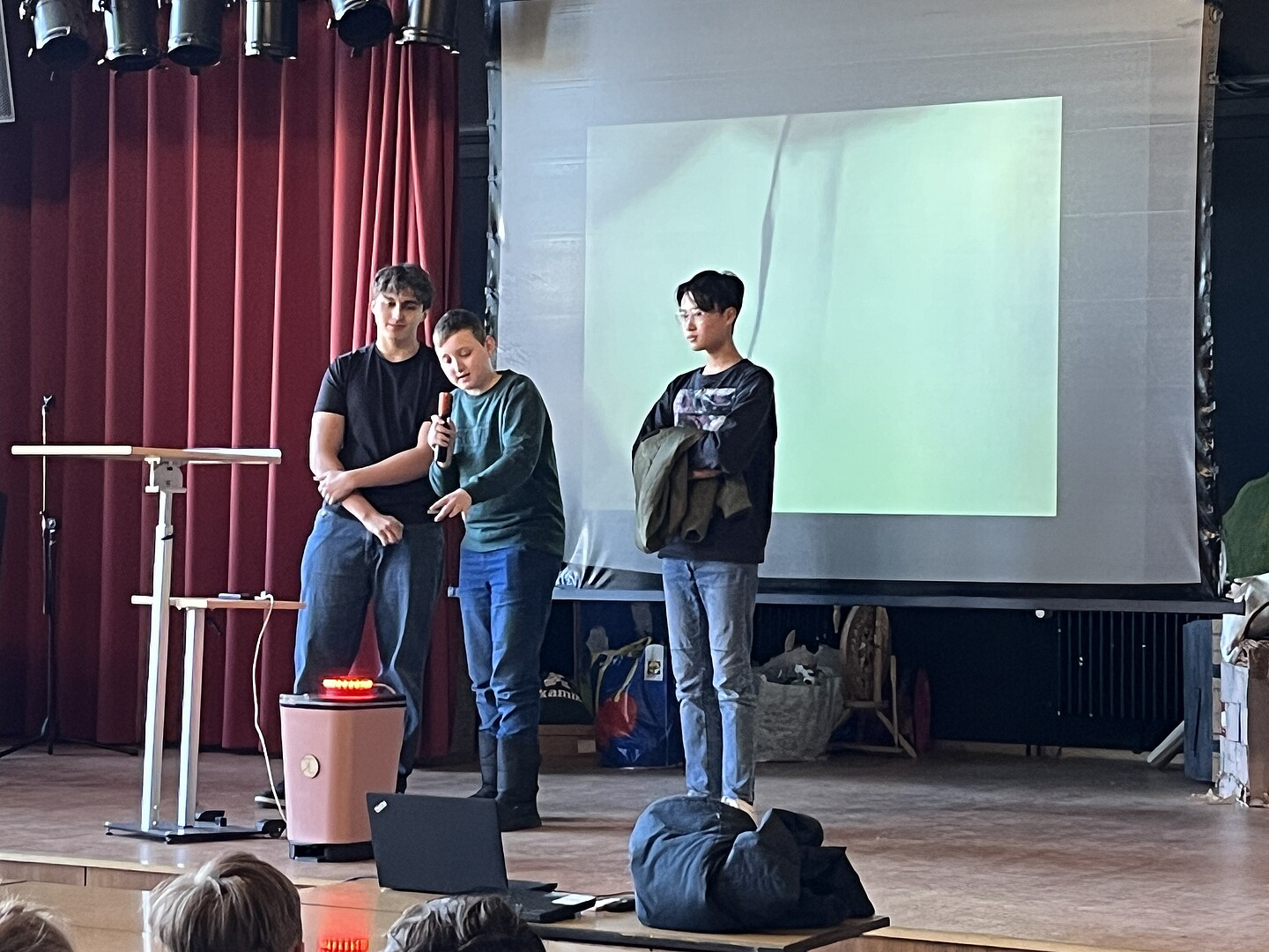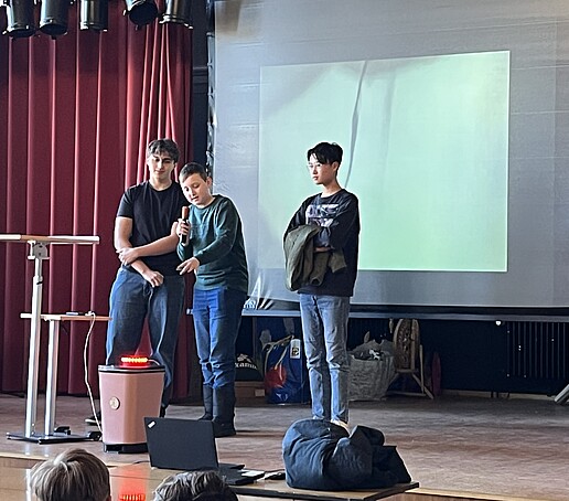Zur Abschlusspräsentation in der Aula waren neben der Schulleitung und den Lehrkräften auch Schülerinnen und Schüler der Klassen 6 und 7 gekommen, die in den kommenden Jahren ebenfalls von Make Your School profitieren werden. Die Gruppen präsentierten ihre Projekte auf der Bühne und stellten ihre Ergebnisse anschließend an „Marktständen“ vor.