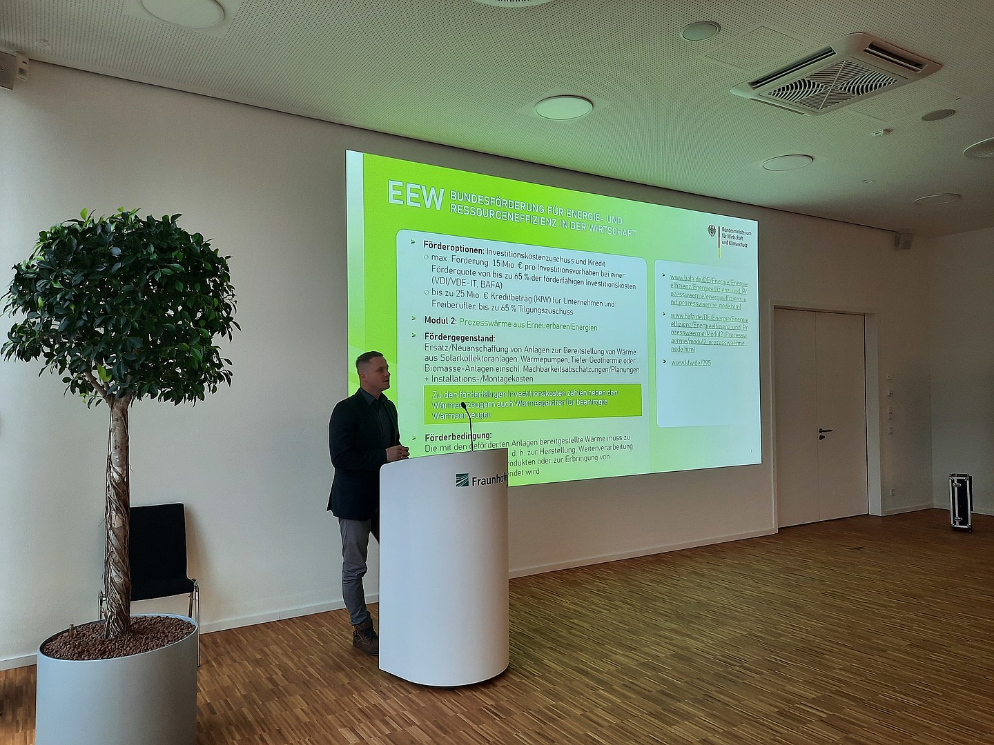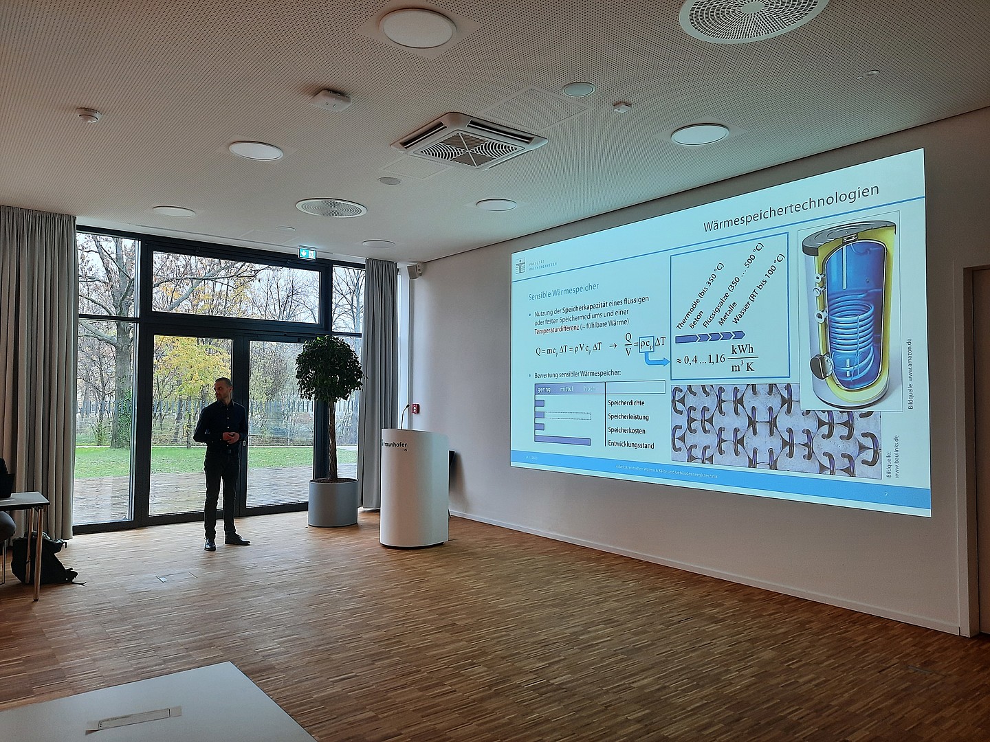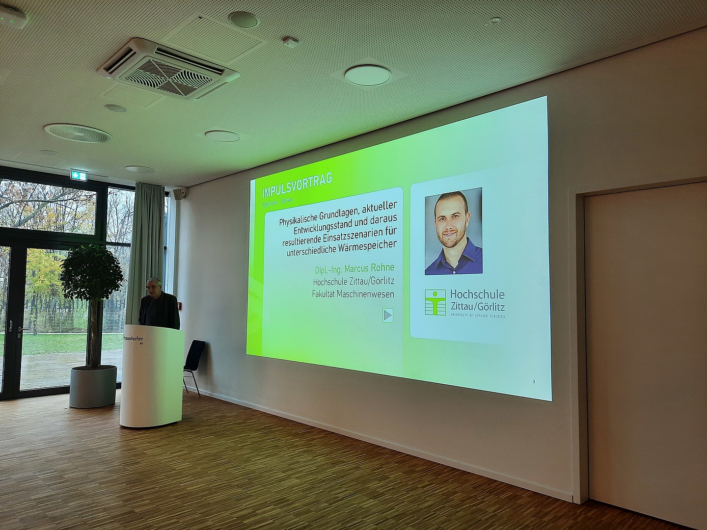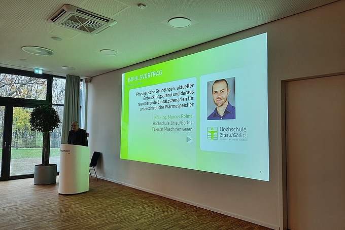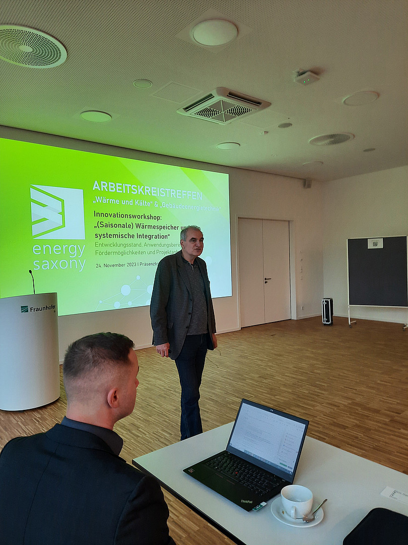Um 10 Uhr am Freitagmorgen eröffnete Dr. Andreas Wilde als Arbeitskreisleiter "Gebäudeenergietechnik" und Gastgeber am Fraunhofer IIS den Workshop. Im Anschluss trug Marcus Rohne, Doktorand an der TU Bergakademie Freiberg und Forschungsmitarbeiter an der Hochschule Zittau/Görlitz, den ersten Impulsvortrag unter dem Titel "Grundlagen, Entwicklungsstand und Einsatzszenarien für Wärmespeicher" vor und führte damit fachlich in die Veranstaltung ein. Der zweite Impuls zur Eröffnung kam von Energy Saxony zu den "Aktuellen Fördermöglichkeiten" und wurde von Dr. Clemens Schneider als Arbeitskreisleiter "Wärme und Kälte" übernommen.