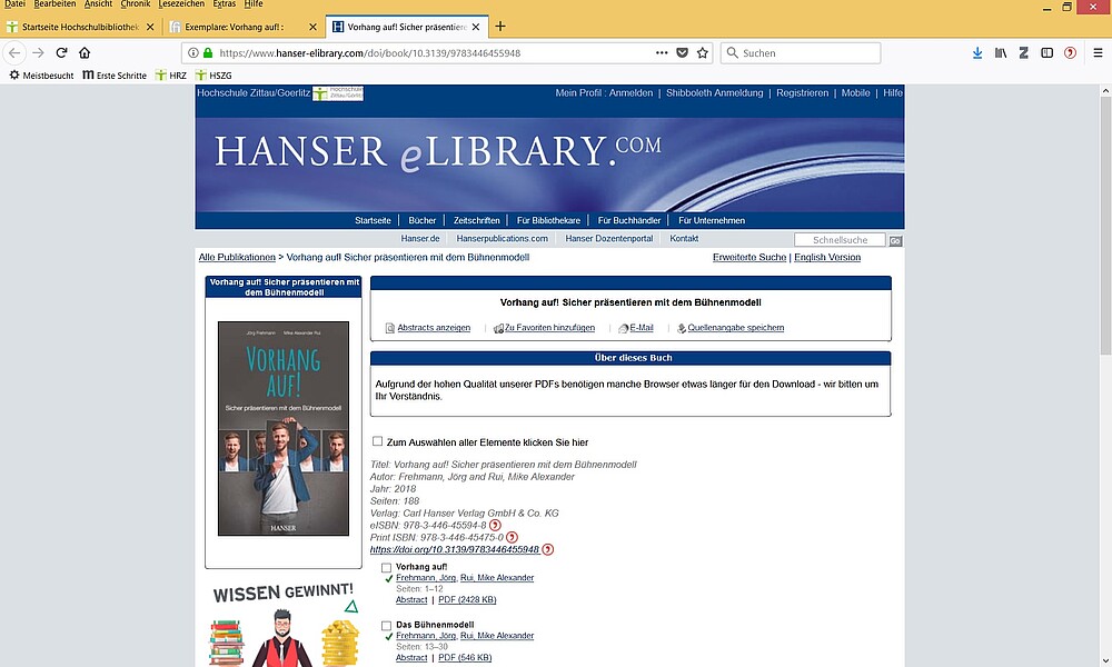 Alle diese elektronischen Bücher sind im Katalog der Hochschulbibliothek und unter "Elektronische Medien" → Hanser zu finden. Ein Teil der 2018er Titel ist bei Hanser noch nicht erschienen. In der Datei "Info zu Hanser 2018" sind die voraussichtlichen Erscheinungsmonate verzeichnet.