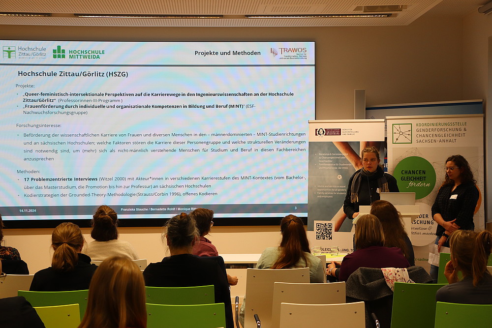 Am 14.11. fand der 13. Landesweite Tag der Genderforschung Sachsen-Anhalt unter dem Titel „Körper – Geschlecht – Gender. Interdisziplinäre Perspektiven“ statt. Dr.in Monique Ritter und Bernadette Rohlf (TRAWOS) waren gemeinsam mit Franziska Stauche (HS Mittweida) vertreten. Im Vortrag „Der männlich*-verregelte Ort Hochschule: Facetten der (De-)Thematisierung von Körperlichkeit des weiblichen* Homo Academicus“ analysierten die Wissenschaftlerinnen anhand ausgewählter Interview-Zitate, die Mechanismen der allgegenwärtigen männlich konnotierten Maßstäbe im akademischen System. Ritter, Stauche und Rohlf forschen mit verschiedener Schwerpunktsetzung zur Unterrepräsentation von Frauen in akademischen Berufen in MINT-Fächern (Mathematik, Informatik, Naturwissenschaft, Technik). Der Vortrag und die anschließende Diskussion konnten zeigen, wie der den MINT-Fächern inhärente Anspruch nach Objektivität und (Geschlechts-)Neutralität sowie der Bezug auf Leistung als vermeintlich geschlechtsneutraler Maßstab die Benachteiligung von Frauen im System nicht nur unsichtbarer macht und verstärkt sondern gleichzeitig dazu führt, dass Erfolg und Misserfolg individualisiert begründet wird und nicht mit patriarchalen Strukturen in Verbindung gebracht wird.