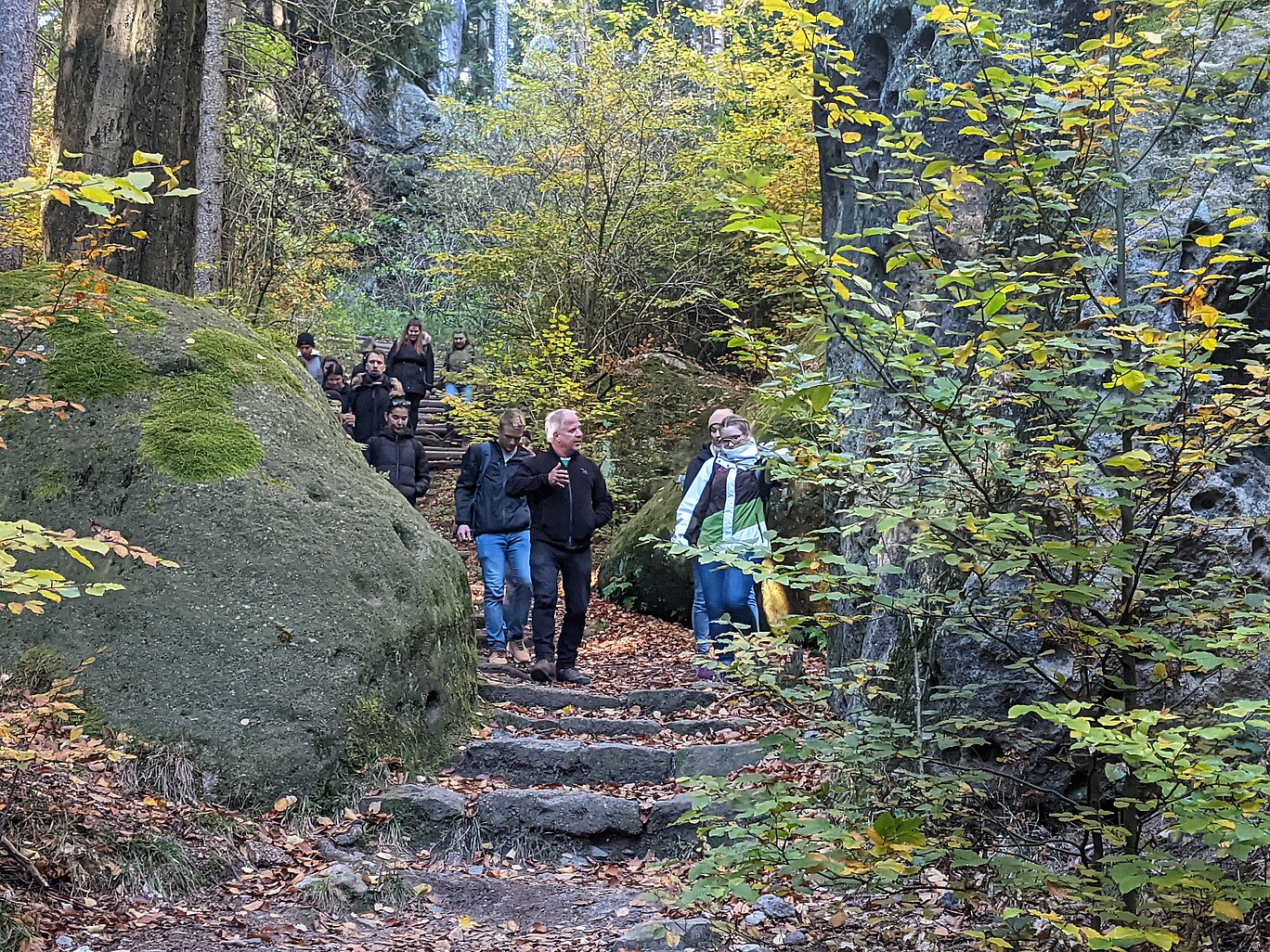 Als Vor-Ort-Experte führte er die Studierenden im Anschluss auf einer Wanderung durch den Naturpark, zu den neuralgischen Punkten im Wegenetz des Zittauer Gebirges. Die Tour führte von Waltersdorf aus nach Jonsdorf, weiter vorbei am Nonnenfelsen und der Gondelfahrt, bis zum Bahnhof der Schmalspurbahn im Kurort Oybin.