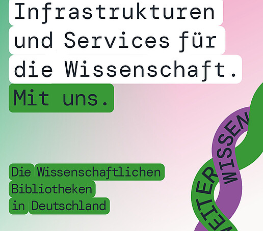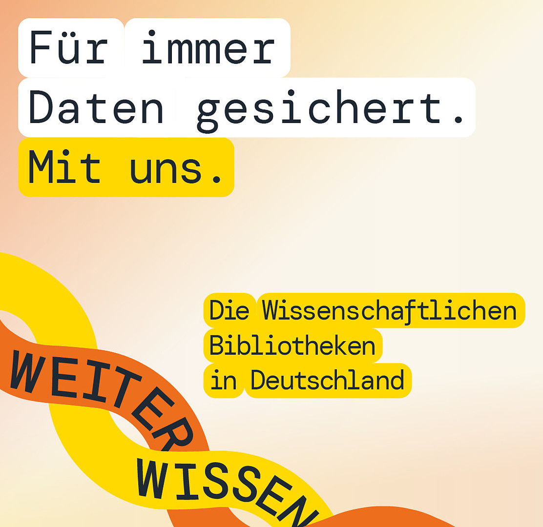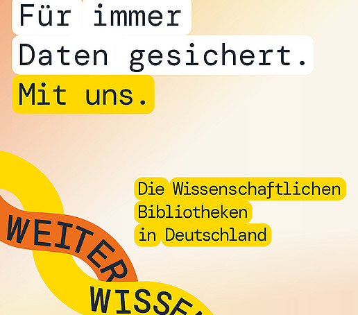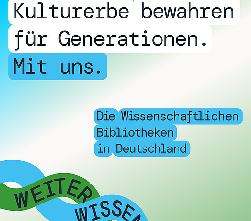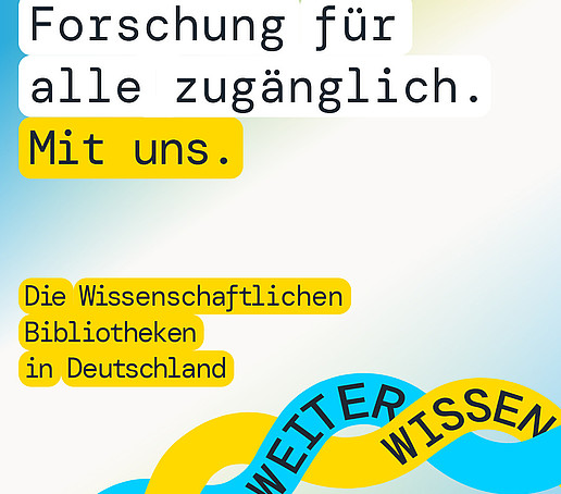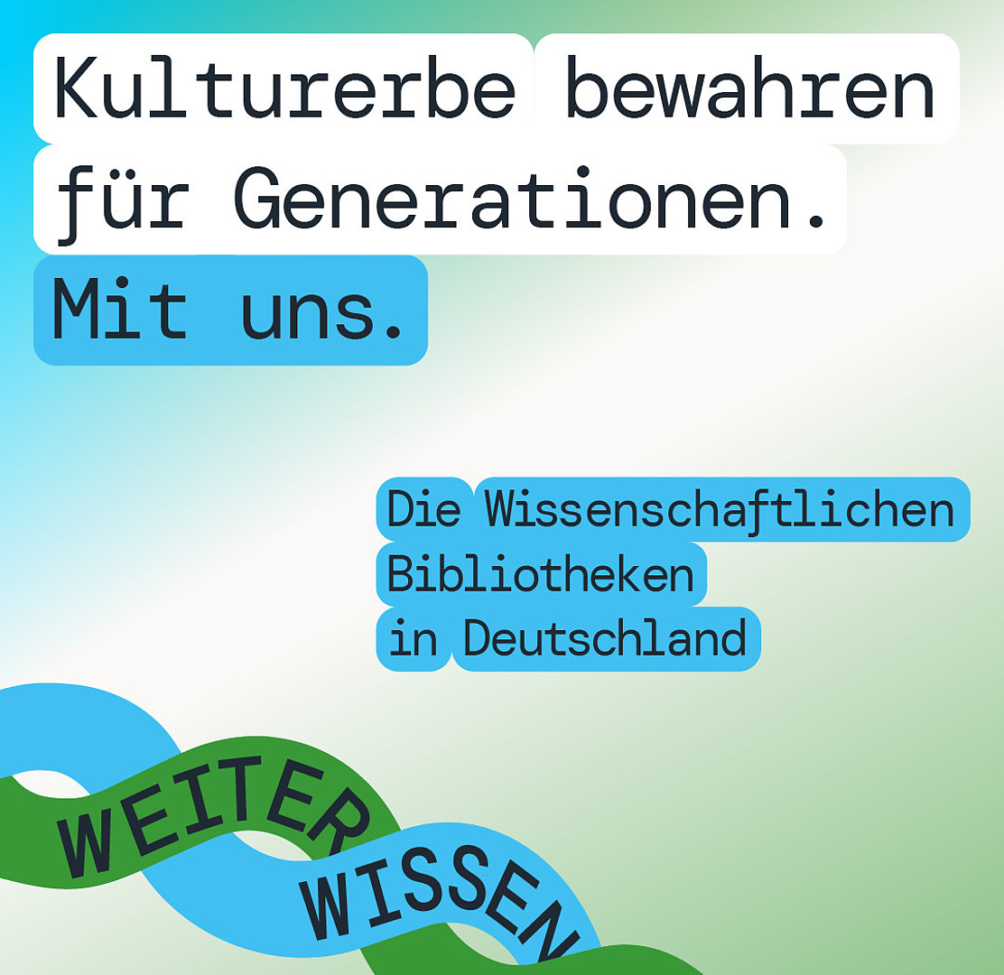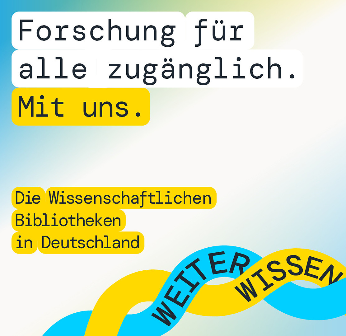 Wissenschaftliche Bibliotheken unterstützen Forschung, Wissenschaft und Lehre nicht nur mit Literatur und Forschungsdaten, sondern sorgen auch dafür, dass diese langfristig gesichert und zugänglich sind. Um diese Leistungen sichtbarer zu machen, haben sich zahlreiche wissenschaftliche Bibliotheken zusammengetan und die Kampagne „WEITER WISSEN. Mit uns.“ entwickelt. Die Kampagne ist eine gemeinsame Initiative der Badischen Landesbibliothek, der Bayerischen Staatsbibliothek, der Deutschen Nationalbibliothek, der Niedersächsischen Staats- und Universitätsbibliothek Göttingen, der SLUB Dresden, der Staatsbibliothek zu Berlin, der Staats- und Universitätsbibliothek Hamburg Carl von Ossietzky, der Universitätsbibliothek Leipzig, der Universitätsbibliotheken der Humboldt Universität zu Berlin, der Freien Universität Berlin sowie der Technischen Universität Berlin, der Universitätsbibliothek Mannheim, der TIB – Leibniz-Informationszentrum Technik und Naturwissenschaften und Universitätsbibliothek, ZB MED – Informationszentrum Lebenswissenschaften sowie ZBW – Leibniz-Informationszentrum Wirtschaft zusammen mit dem Deutschen Bibliotheksverband e.V. (dbv).