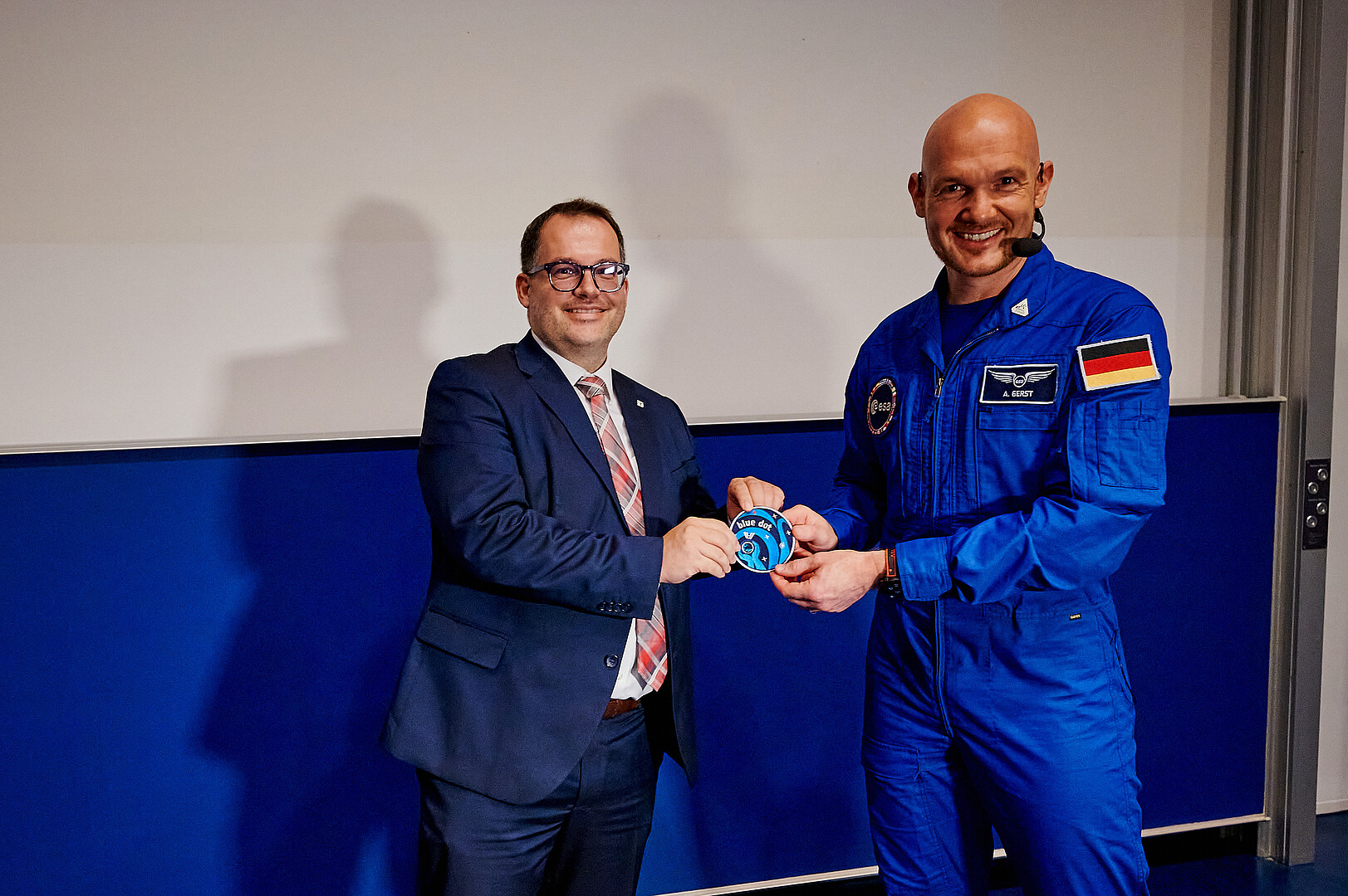Als Rektor dieser Hochschule und auch ganz persönlich ist es mir eine große Ehre und Freude, das Emblem der Mission Blue Dot 2014 aus Alexander Gersts Händen entgegennehmen zu dürfen. Mit dem Raumanzugaufnäher hält ein Stück Weltall Einzug in unsere Hochschule. Er wird einen Ehrenplatz bekommen und uns stets daran erinnern, dass die Menschheit in der Lage ist, Großes zu leisten.