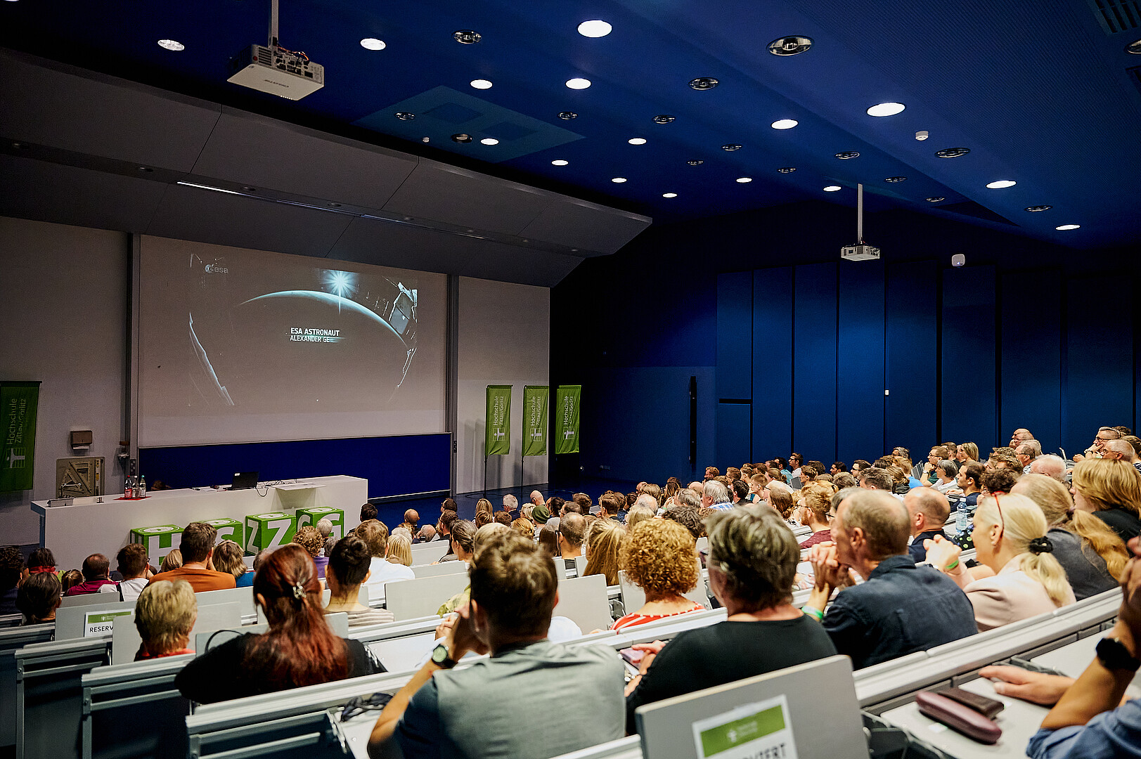 Neben den persönlichen Erlebnissen gab Dr. Gerst auch einen Ausblick auf die zukünftigen Pläne der Menschheit im Weltraum. Er erläuterte u. a. die geplante Erforschung des Mondes und hob die Bedeutung wissenschaftlicher Forschung und internationaler Zusammenarbeit hervor. Alexander Gerst war zweimal bei der internationalen Raumstation ISS, dem größten Außenposten der Menschheit im All, und führte dort beispielsweise Experimente für die medizinische Forschung zu Alzheimer und Krebs durch. Mit seinen anschaulichen Fotos und Videos von der ISS wurde deutlich, wie diese Missionen neue Erkenntnisse liefern und unseren Blick auf den Planeten Erde inspirierend verändern können.