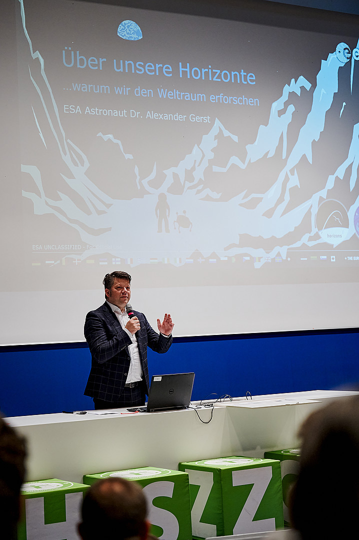 In seinem Vortrag nahm Dr. Gerst die Zuhörer*innen mit auf eine Reise durch seine spannenden Erlebnisse als Astronaut. Er schilderte eindrucksvoll, wie es sich anfühlt, die Erde als kleine blaue Murmel im unendlichen All zu sehen, und welche Emotionen ihn überkamen, als er Europa und andere Teile der Welt aus dem Weltraum betrachtete.