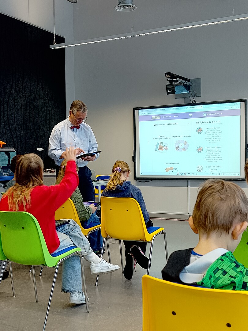 Referent war Prof. Dr.-Ing. Klaus ten Hagen, Fakultät Elektrotechnik und Informatik, der Hochschule Zittau/Görlitz, der sich zu den Schülerinnen und Schülern begeistert äußerte. “Ich erklärte, dass ich ihnen Programmieren zeigen werde und sie haben ihre Tablets rausgeholt. Das hätte ich nicht erwartet. Als dann die WiFi Zugangsdaten an der Tafel standen und die Schülerinnen und Schüler fragten, was sie machen sollten, antwortete der begleitende Lehrer: 'Wie im Unterricht', und sie waren im Internet. Die Schüler haben das scratch.mit-Programm aufgerufen und fleißig mitprogrammiert. Alle haben die vorgestellten Programme auf ihren Tablets eingegeben und ablaufen lassen. Ich bin beeindruckt!”