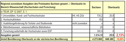 Abb. 5:               Ausgaben des Freistaates Sachsen gesamt und Oberlausitz im Bereich Wissenschaft (Hochschulen und Forschung) in TEUR, EP 12 2007, S. 1. Aus: Matthias Theodor Vogt unter Mitarbeit von Philipp Bormann, Andreas Bracher, Vladimir Kreck und Katarina Markovic-Stokes: Serbski ludowy ansambl | Sorbisches National-Ensemble. Edition kulturelle Infrastruktur Band 1. Frankfurt am Main 2009. S. 69.