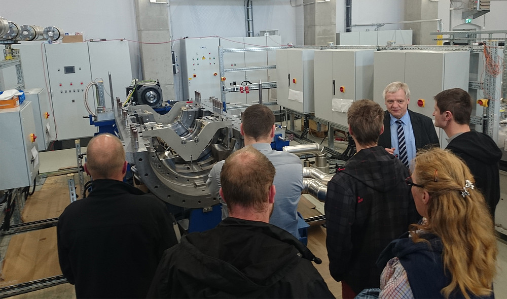 Im Zittauer Kraftwerkslabor (ZKWL) - dem größten Forschungskomplex des IPM, untergebracht in einer Halle der Zittauer Stadtwerke - wurden die drei Versuchsstände vorgestellt: Das Thermochemische Versuchsfeld I (Prof. Zschunke), der Magnetlagerversuchsstand (Prof. Worlitz) und die Thermische Energiespeicheranlage (Prof. Kratzsch und Prof. Kästner). Die in den letzten Jahren neu errichteten Anlagen werden die Forschung in wesentlichen Bereichen des Schwerpunktes "Energie und Umwelt" ermöglichen: Effizienzsteigerung von zentralen und dezentralen Stromerzeugern mit Hilfe von Speichern sowie Leistungserhöhung von Großlagern durch die Magnetlagertechnologie. Mit den Präsentationen und in direkten Gesprächen wurden die Möglichkeiten des ZKWL dargestellt und erste Ansatzpunkte für konkrete Kooperationen diskutiert.