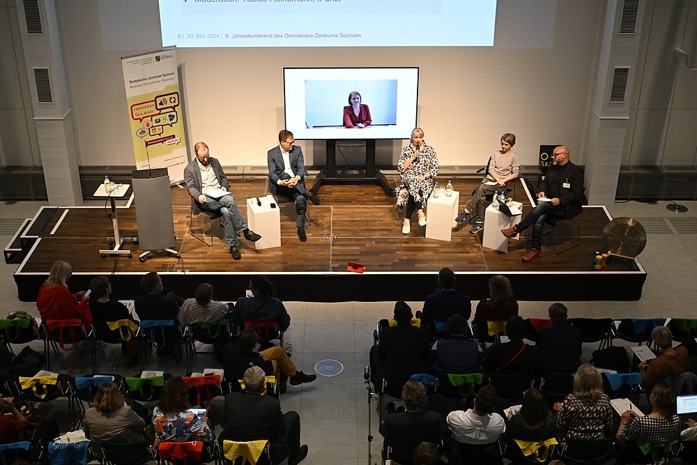 Auf Einladung der Staatsministerin für Soziales und Gesellschaftlichen Zusammenhalt, Petra Köpping, haben am 30.05.2024 mehr als 200 Fachleute aus ganz Sachsen an der 9. Jahreskonferenz des Demokratie-Zentrums Sachsen in Dresden teilgenommen. Die Schwerpunkte der Konferenz lagen in diesem Jahr auf der Zukunft der Demokratie in (Ost-)Deutschland, dem Machtzuwachs autoritär-populistischer und rechtsextremer Akteure sowie weiteren drängenden Herausforderungen zum Erhalt der wehrhaften Demokratie: Wie bleiben wir handlungsfähig angesichts der zunehmenden Popularität rechtsautoritärer Akteure? Welche Rolle spielen Desinformationen in Wahlkampfzeiten? Wie sprechen wir über Antisemitismus in der Post-Migrationsgesellschaft? Welche Chancen und Herausforderungen bestehen aktuell für die Demokratie im Freistaat Sachsen?