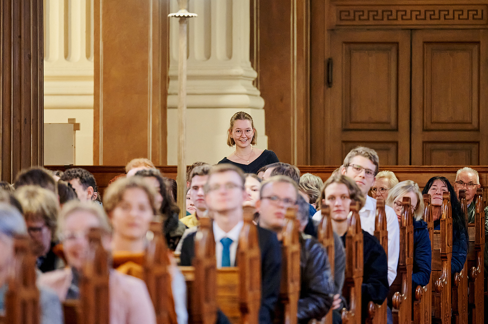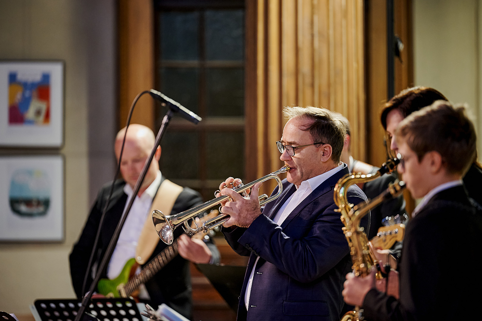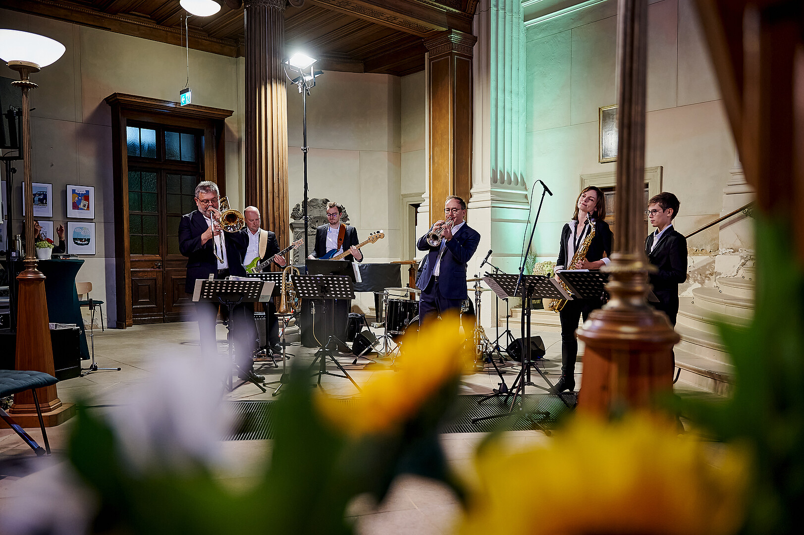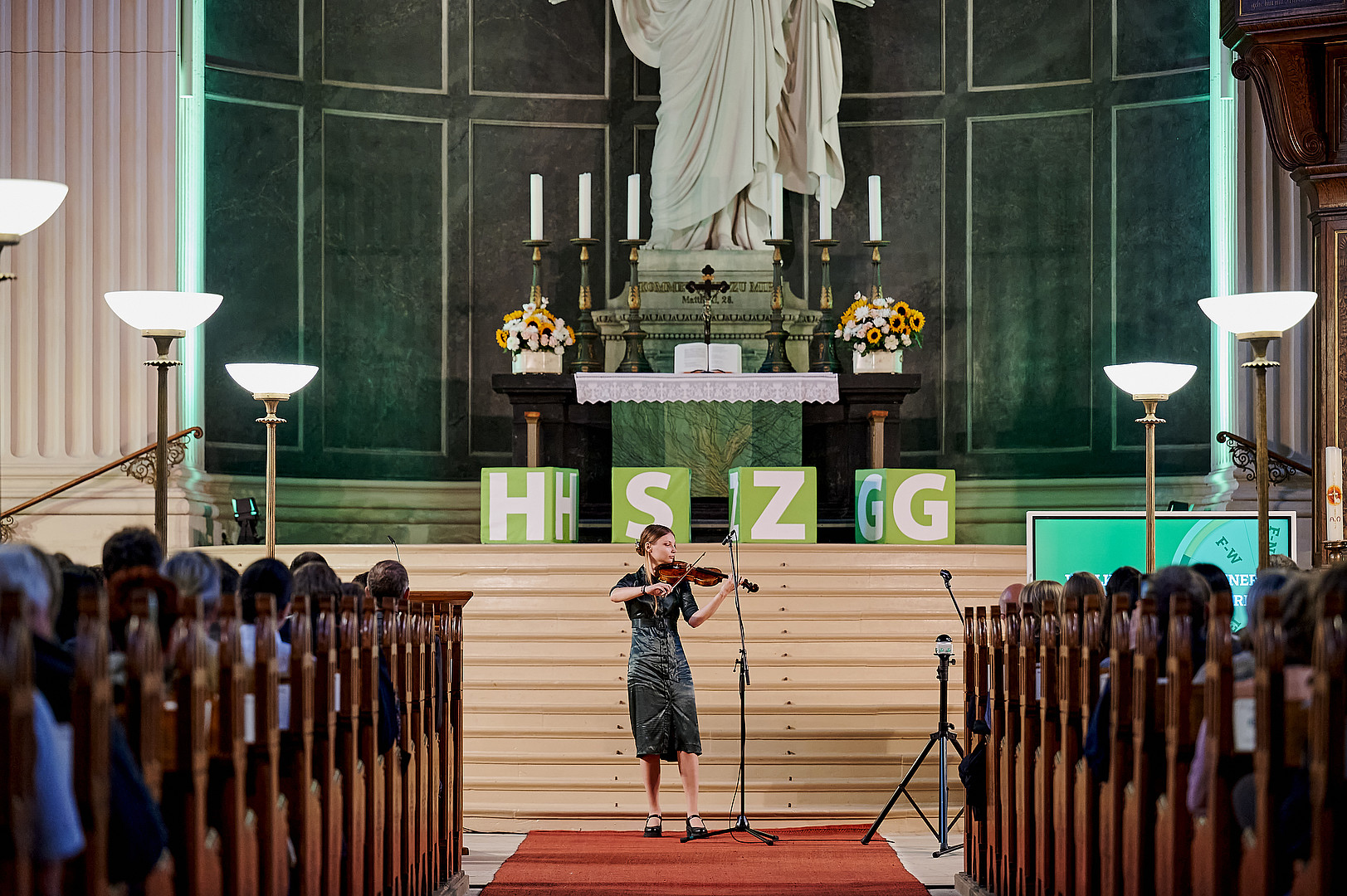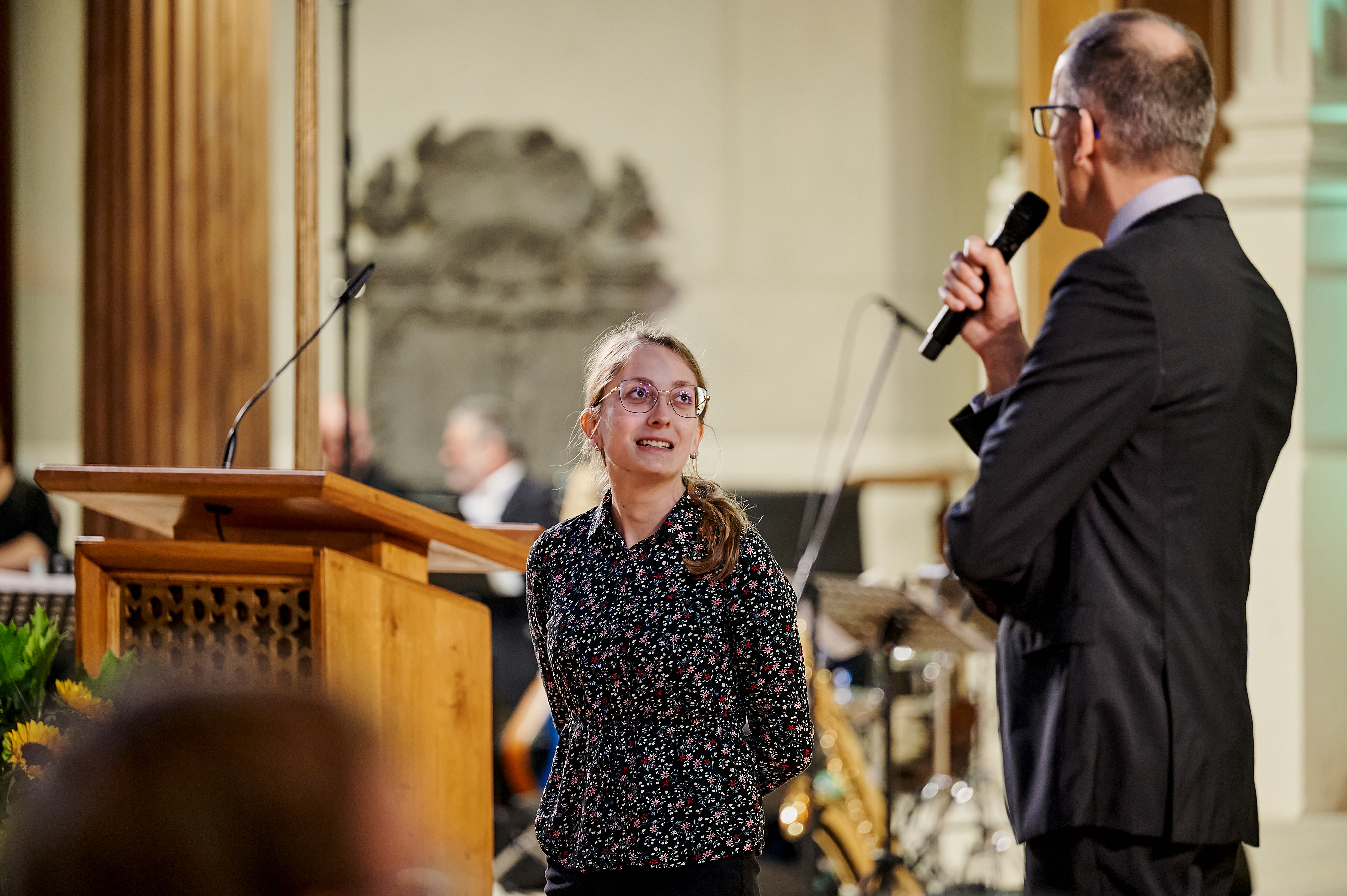 Musikalisch wurde das Programm von der Big-Band Klangfarben umrahmt, die aufgrund des zur Verfügung stehenden Platzes in einer kleineren Besetzung auftrat. Kantor Johannes Dette beindruckte an der Orgel mit fulminanten Klängen, während Kultur und Management-Studentin Romy Wolf das Publikum mit ihrem Geigenspiel nach dem Motto: „Pop-meets-Classic“ verzauberte.