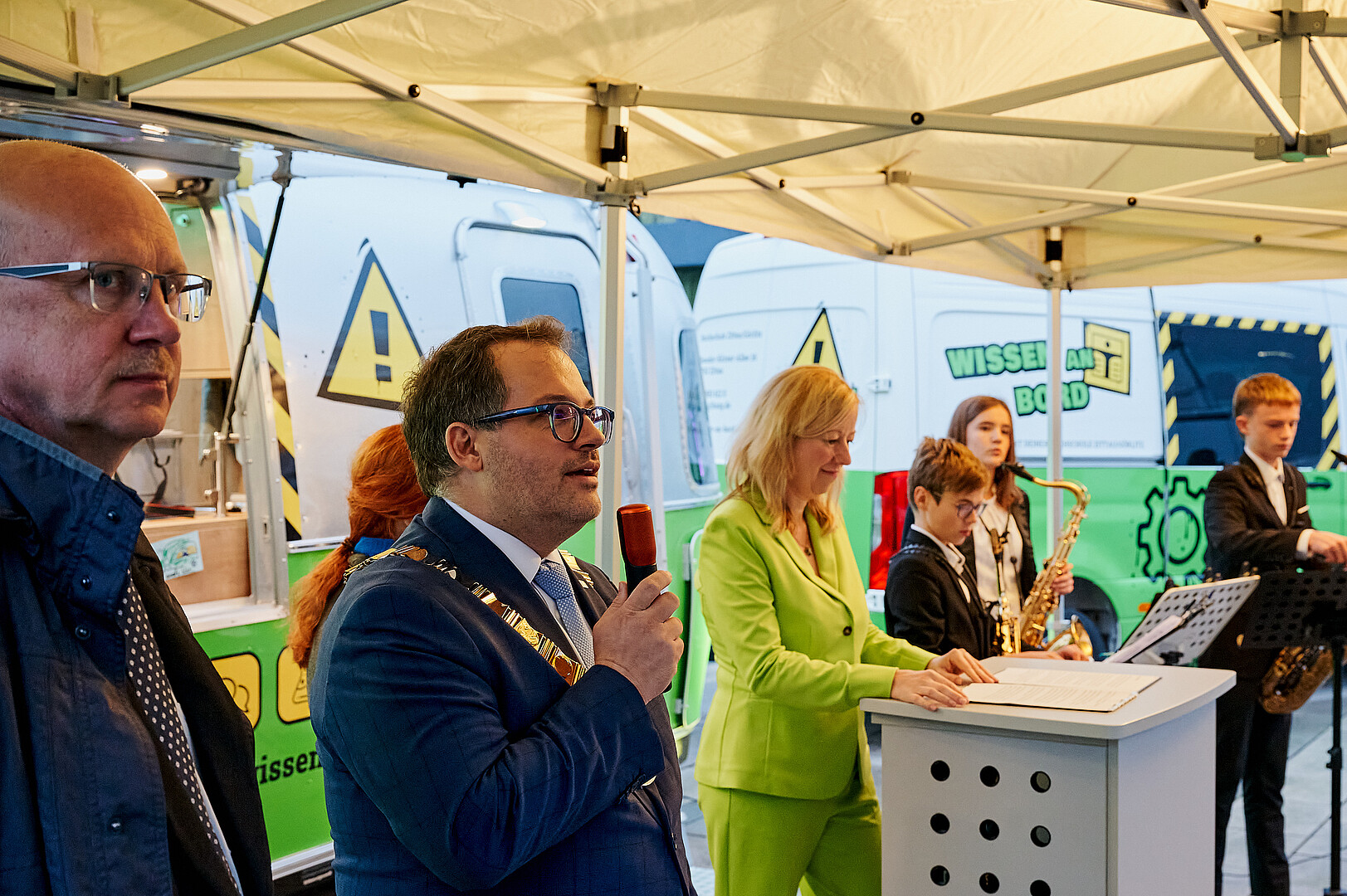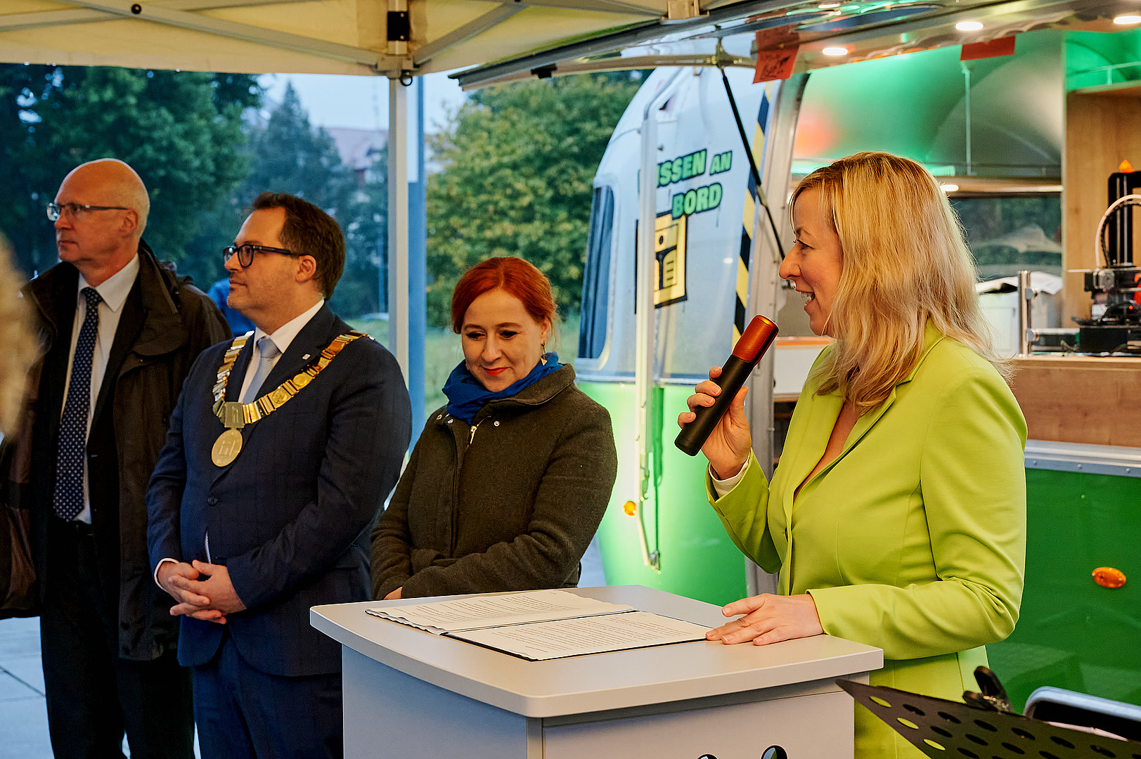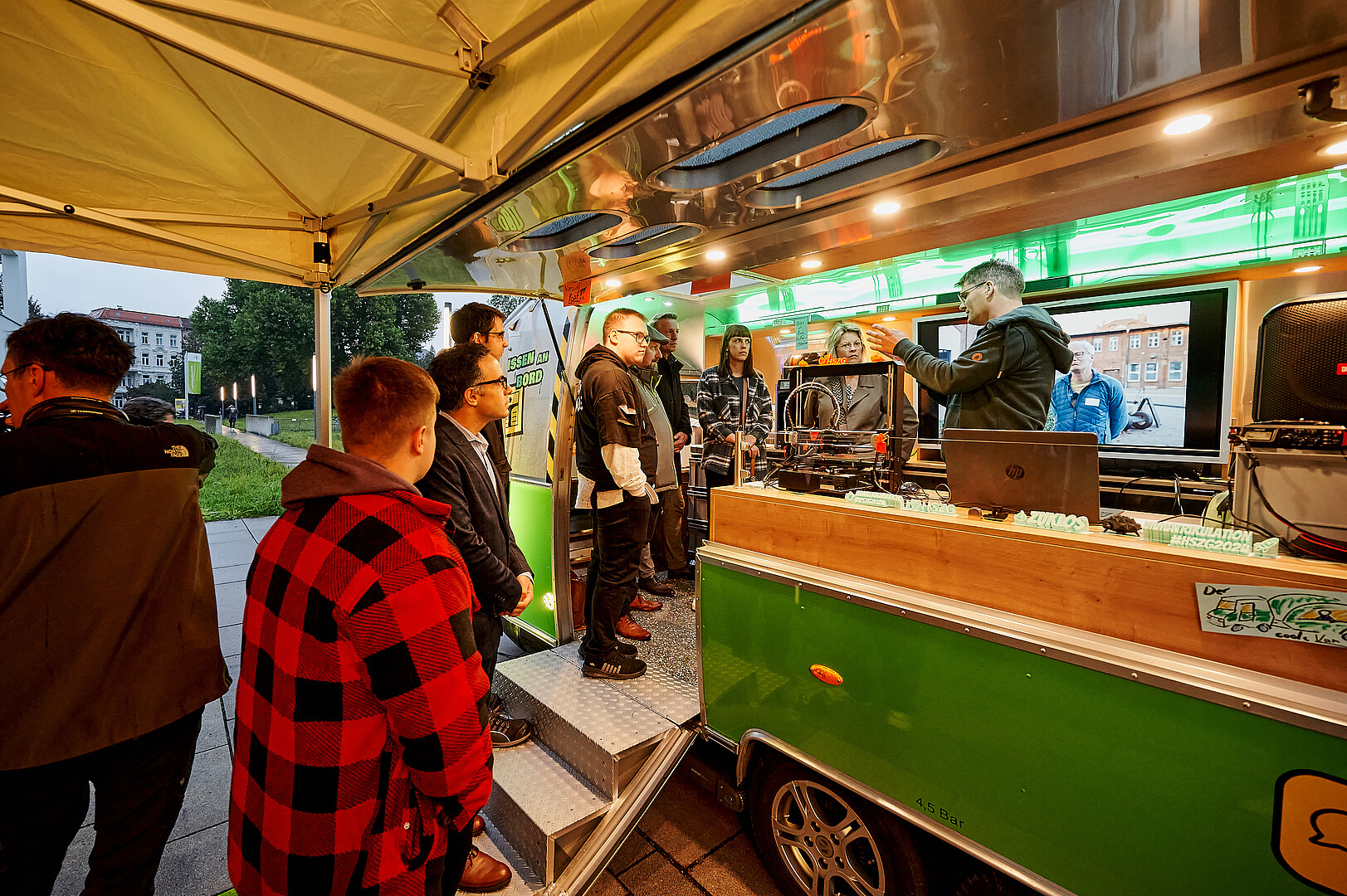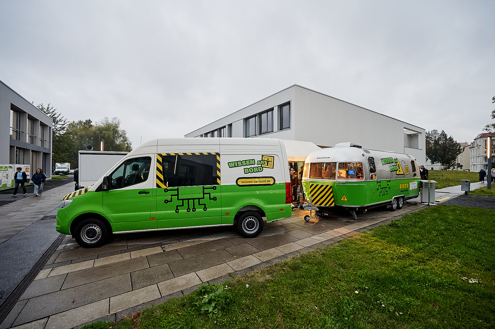 Ein weiteres Highlight stellte dabei die Einweihung des ZukLOS-Anhängers „Mobile Lernorte“ zur Studierendengewinnung im Bereich der MINT-Bildung dar. Die außerschulische Bildungslandschaft der Oberlausitz wird künftig durch das Projekt Zukunftslernort Oberlausitz (ZukLOS) noch stärker als bisher innovative Lernmöglichkeiten im MINT-Bereich bieten, um Jugendliche individuell zu fördern. Der neue Sprinter mit Anhänger wird künftig als dezentrales Angebot Schulen und andere Bildungseinrichtungen ansteuern, um Schüler*innen vor Ort mit vielen On-Board-Experimenten für MINT-Fächer zu begeistern.