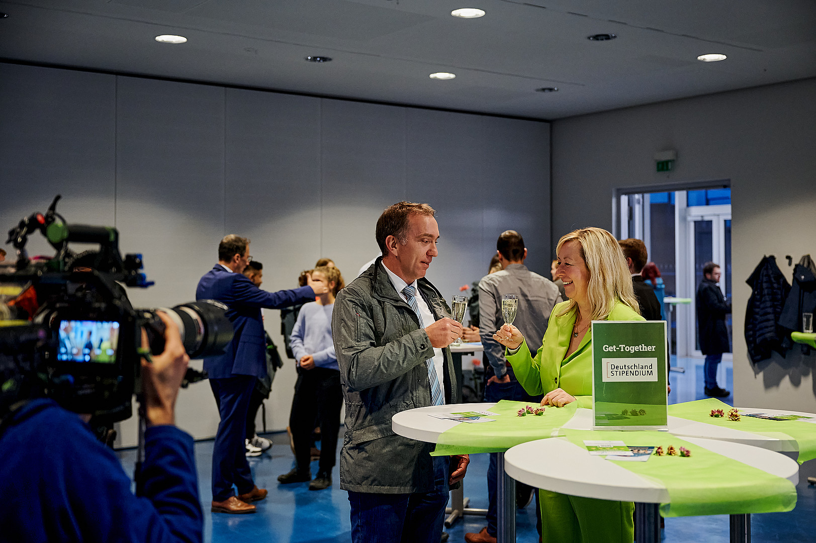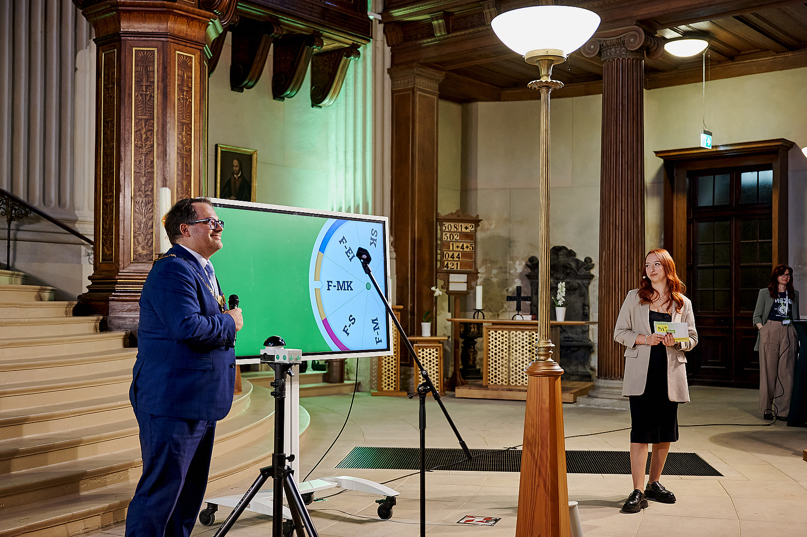 Ein Highlight bildete der Symbolische Immatrikulationsakt, bei dem der Rektor ein digitales Glücksrad bediente, das der Moderatorin verriet, welche Fakultät sie als nächstes dem Publikum näher vorstellen sollte. Hierzu stellte sie jeweils einem oder einer Studierenden im Publikum und der zugehörigen Dekanin bzw. dem zugehörigen Dekan ein paar Fragen. Die kurzweilige und informative Vorstellungsrunde, die auch das Studienkolleg einschloss, fand großen Anklang.