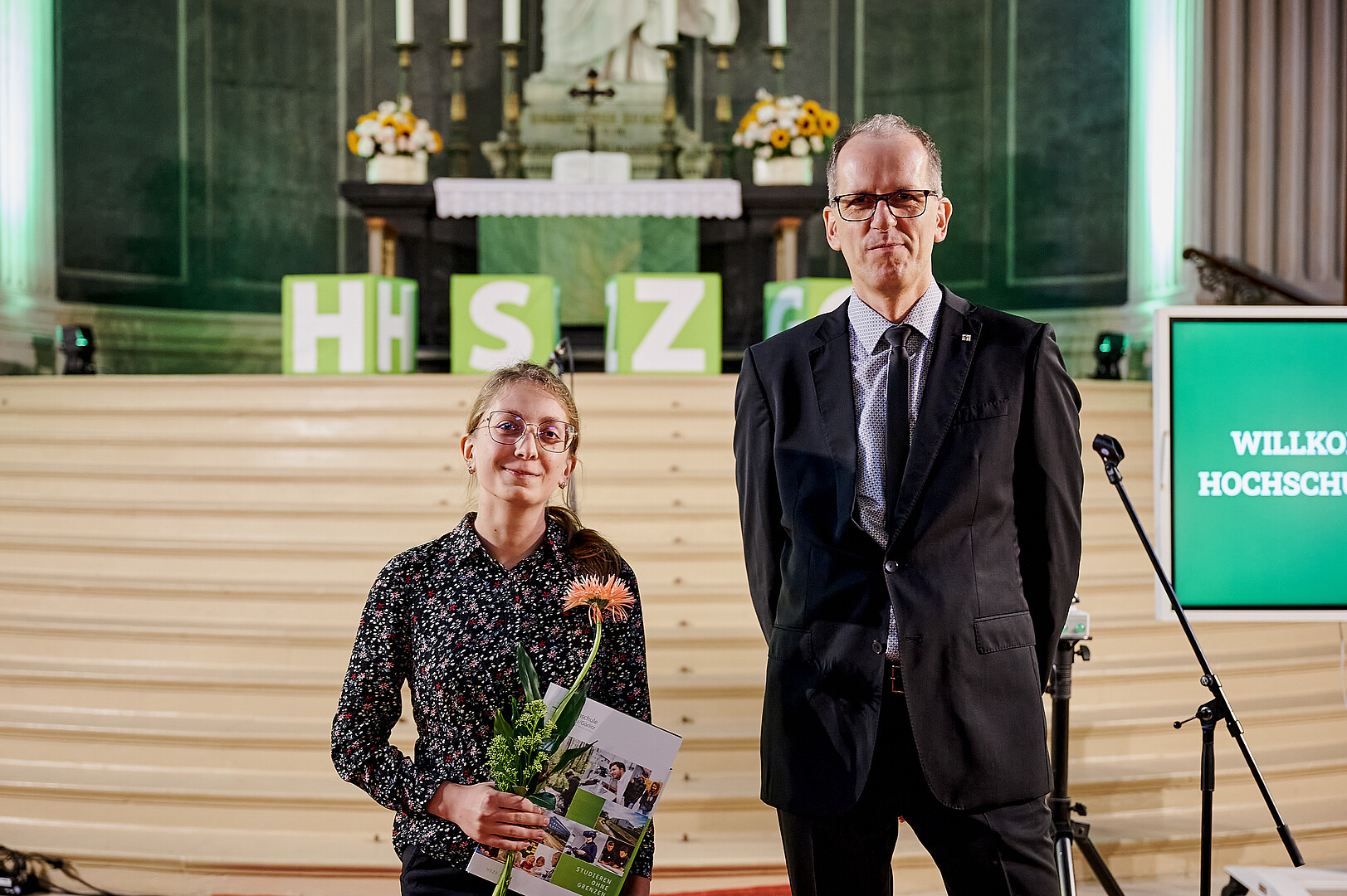 Eine frisch gebackene Studentin konnte sich besonders darüber freuen, von Moderatorin Aileen Baumgärtner direkt angesprochen zu werden. Pia Hegewald, Studentin der Molekularen Biotechnologie, hat im Frühjahr beim Hochschulinformationstag beim HSZG-Gewinnspiel mitgemacht und durfte sich nun über den Hauptgewinn: ein exklusiv gestaltetes HSZG-Longboard freuen.