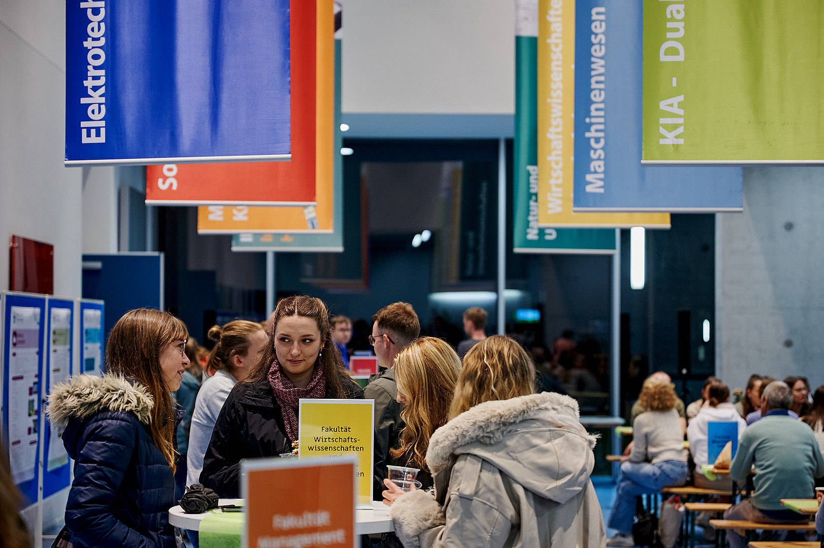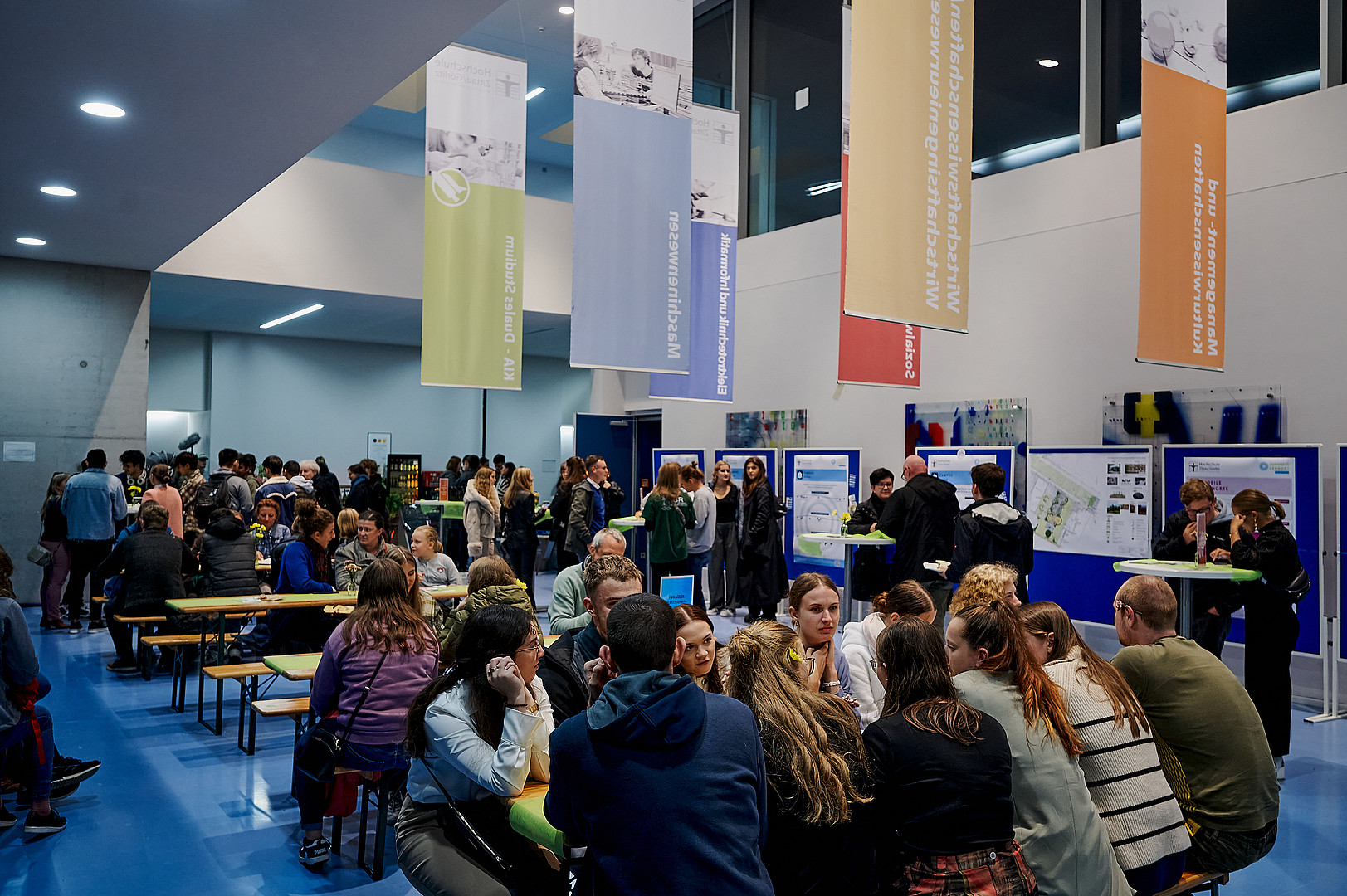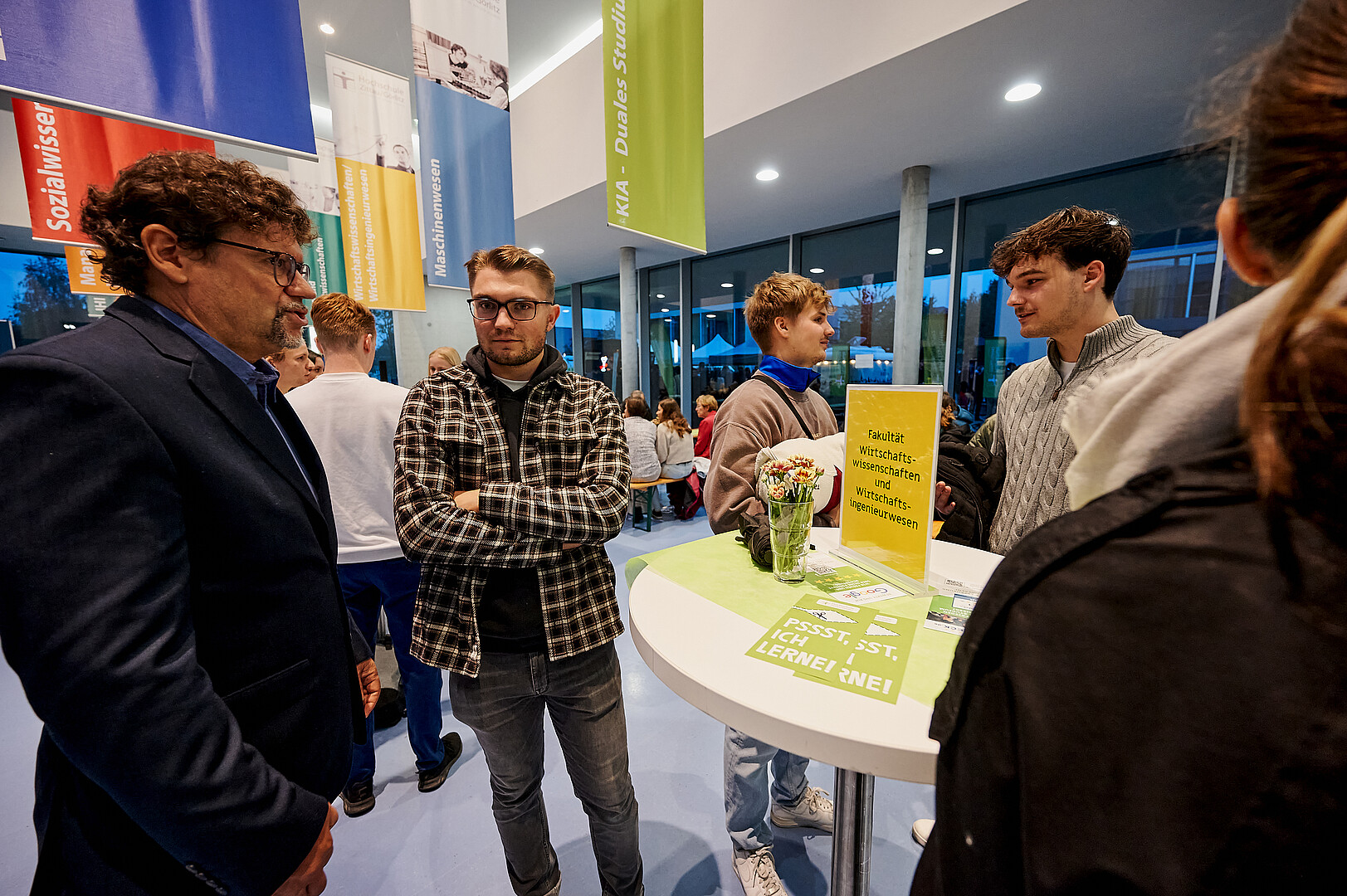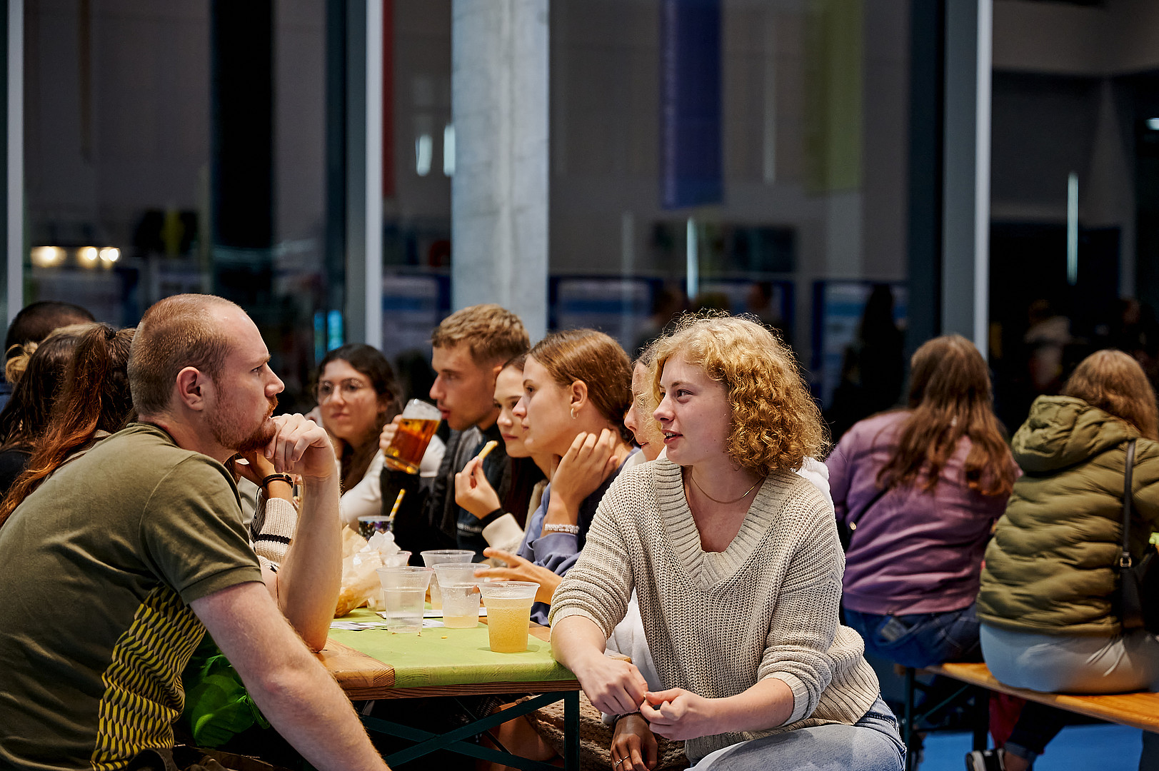 Wer von den Erstis noch offene Fragen hatte, mit Kommiliton*innen ins Gespräch kommen oder einfach erste Kontakte mit der eigenen Fakultät knüpfen wollte, konnte sich an Ansprechpartner an den Fakultätstischen und dem Infotisch des Studienkollegs wenden. Zahlreiche Studierende höherer Semester und Mitarbeitende standen den Neuimmatrikulierten Rede und Antwort.