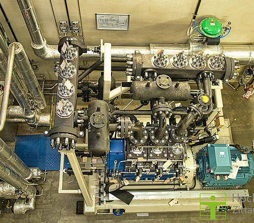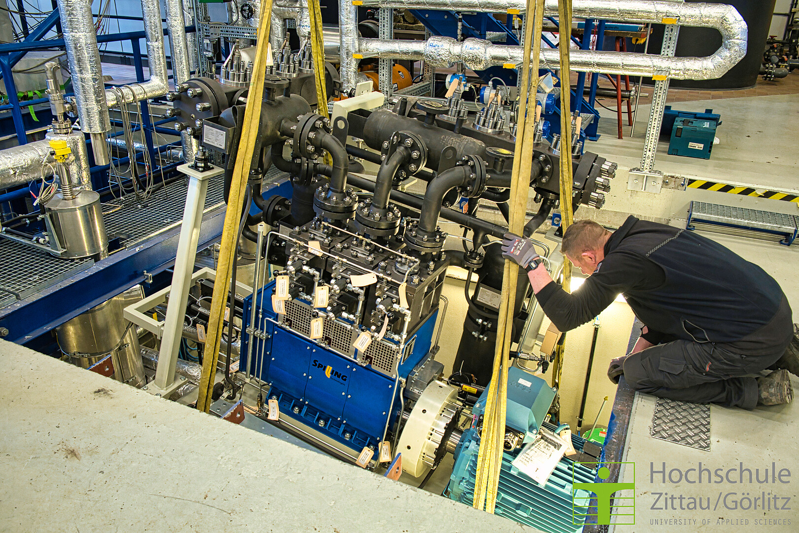 Nun kann die experimentelle Untersuchung der neu entwickelten einzigartigen Kombimaschine, die eine Kernkomponente für den Aufbau der TMS-Batterie ist, starten. Die TMS Batterie ist ein thermo-mechanisches Stromspeichersystem (CARNOT-Batterie) zur Sektorenkopplung von Strom und Wärme. Ihr Herzstück ist eine mehrzylindrige Kolbenmaschine, die sowohl als Wärmepumpe (Verdichter) als auch als Wärmekraftmaschine (Expander) betrieben werden kann. Damit kann Strom in Dampf gespeichert, und auch wieder zu Strom zurückgewandelt werden. (mehr Infos: auf https://www.hszg.de/news/wie-funktioniert-die-tms-batterie)
