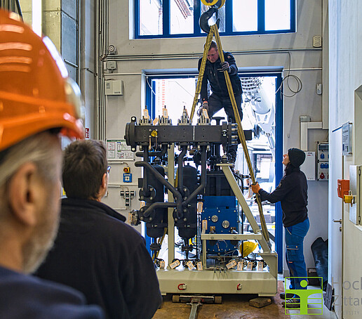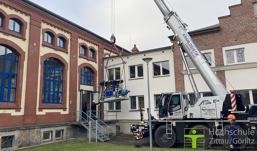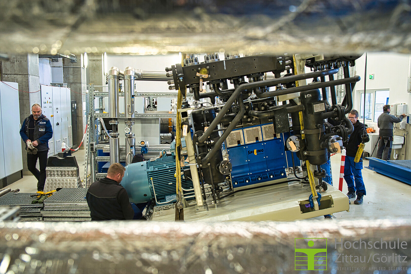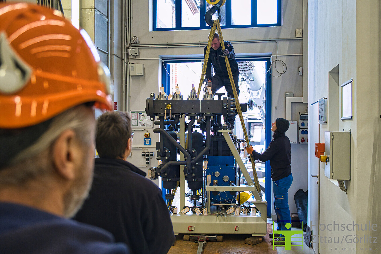 Ein komplizierter Einhub unter engen Platzverhältnissen gelang dem TMS-Projektteam des Instituts für Prozesstechnik, Prozessautomatisierung und Messtechnik (IPM) am 15. Februar 2022 im Zittauer Kraftwerkslabor. Gemeinsam mit den Kollegen des Projektpartners Spilling Technologies Hamburg und weiteren eingebundenen Gewerken wurde die 6,5t schwere Maschine mithilfe eines Krans untergebracht. Bis es soweit war, waren 22 Monate intensive Vorbereitung notwendig.