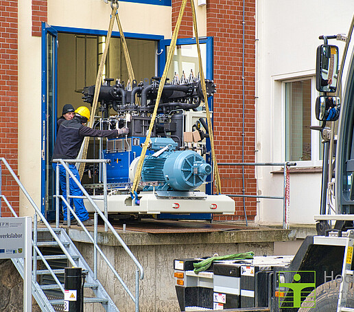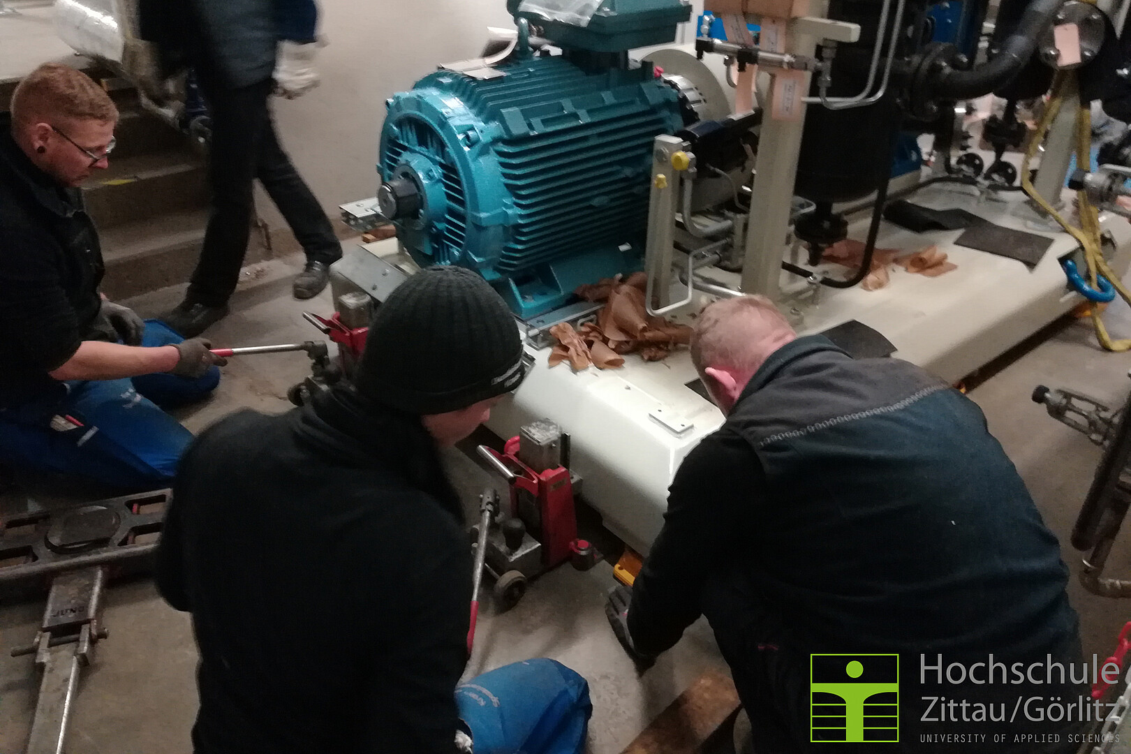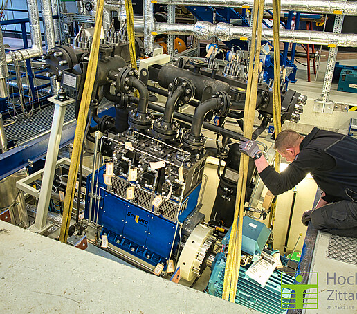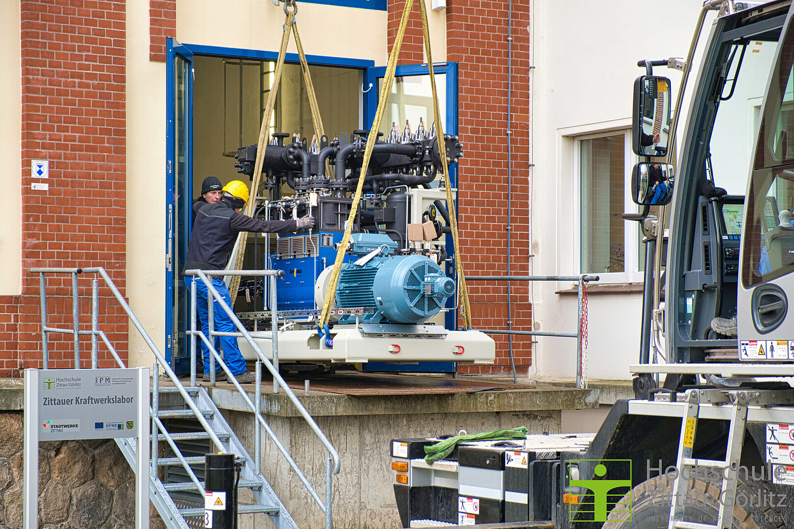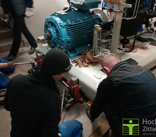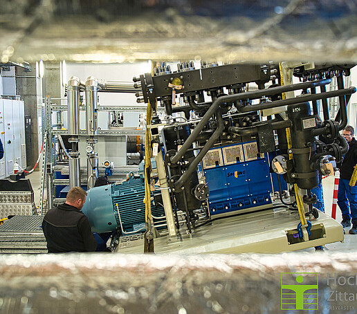 Ein komplizierter Einhub unter engen Platzverhältnissen gelang dem TMS-Projektteam des Instituts für Prozesstechnik, Prozessautomatisierung und Messtechnik (IPM) am 15. Februar 2022 im Zittauer Kraftwerkslabor. Gemeinsam mit den Kollegen des Projektpartners Spilling Technologies Hamburg und weiteren eingebundenen Gewerken wurde die 6,5t schwere Maschine mithilfe eines Krans untergebracht. Bis es soweit war, waren 22 Monate intensive Vorbereitung notwendig.