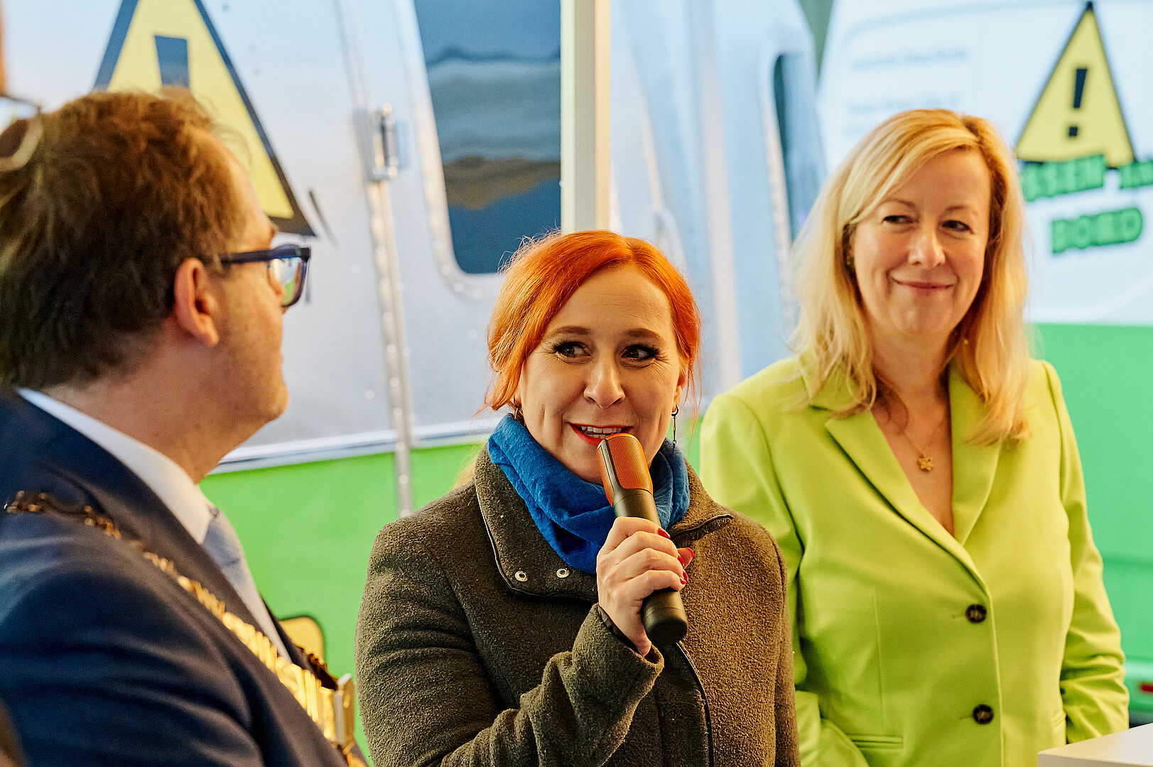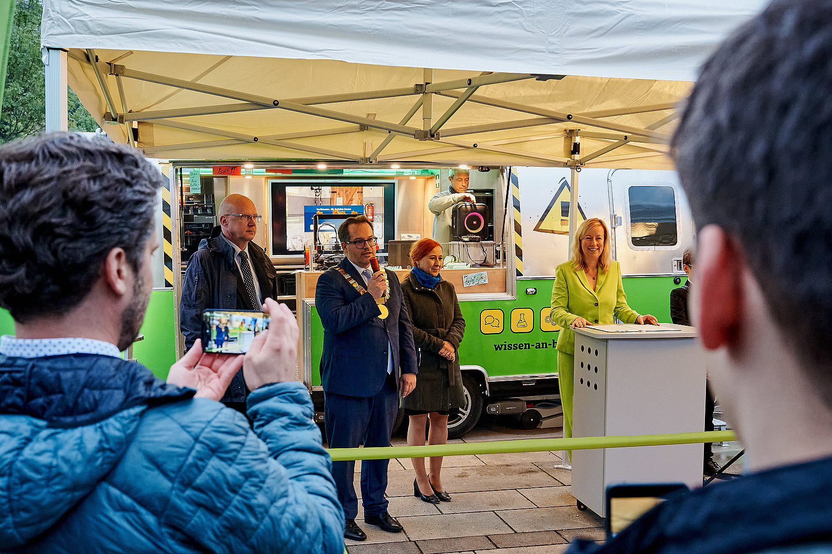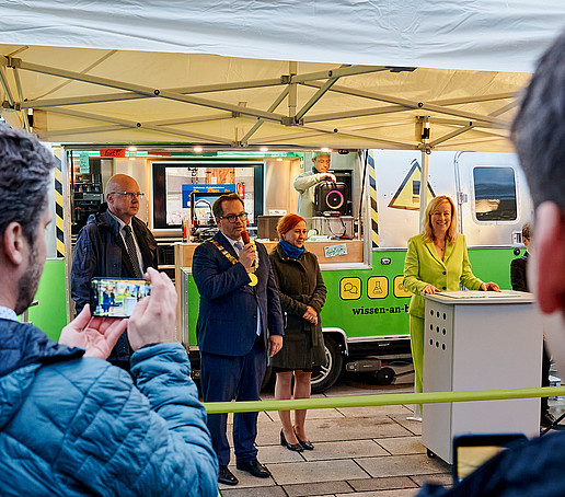 Nach der offiziellen Einweihung nutzten viele der anwesenden Gäste die Gelegenheit, den neuen Lernort zu erkunden und auch die Experimentierstationen selbst auszuprobieren. Sie zeigten sich von der modernen Lernumgebung und den technischen Möglichkeiten im ausgebauten Airstream-Anhänger begeistert und informierten sich über die vielfältigen Funktionen und Einsatzmöglichkeiten.