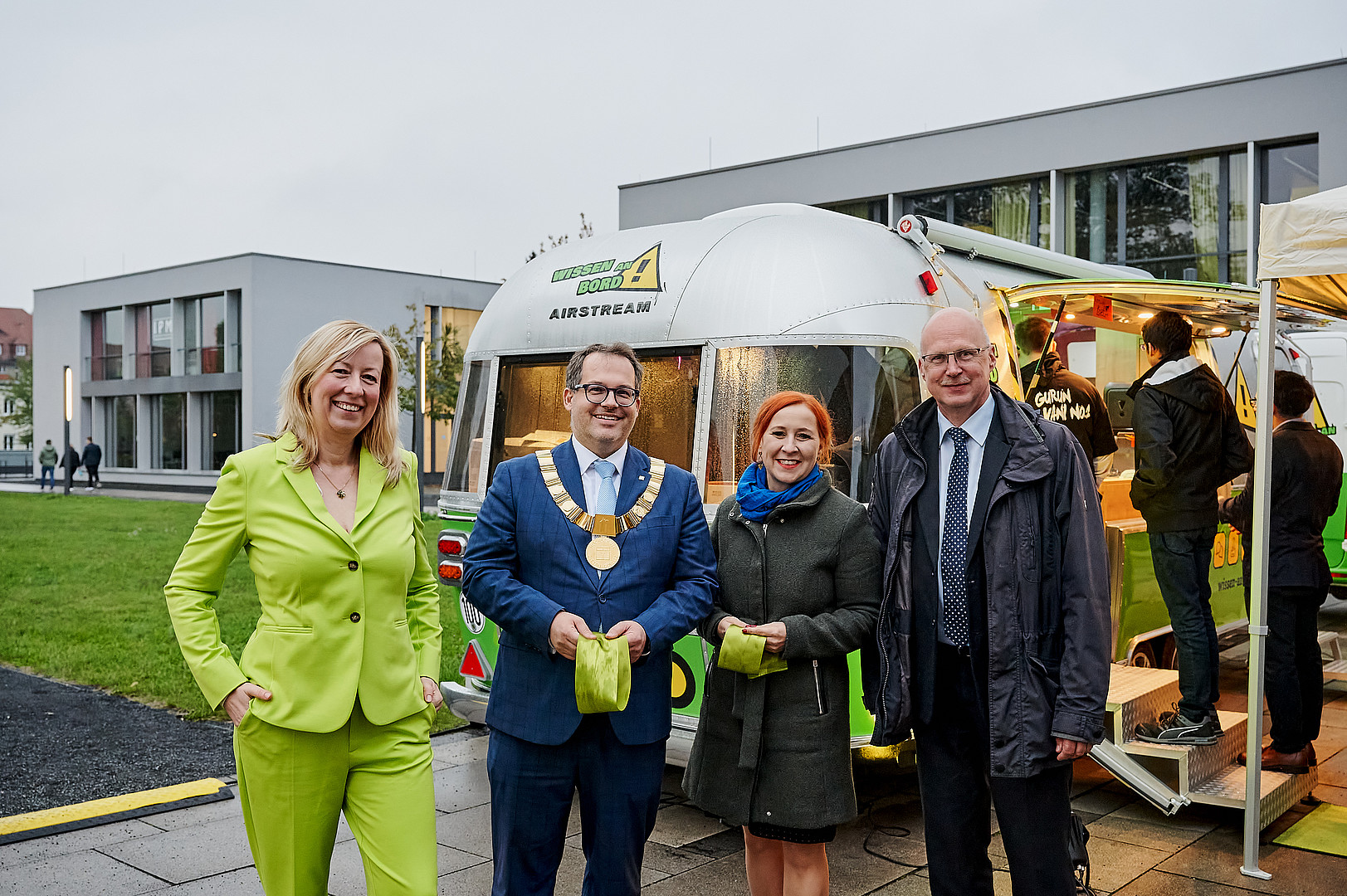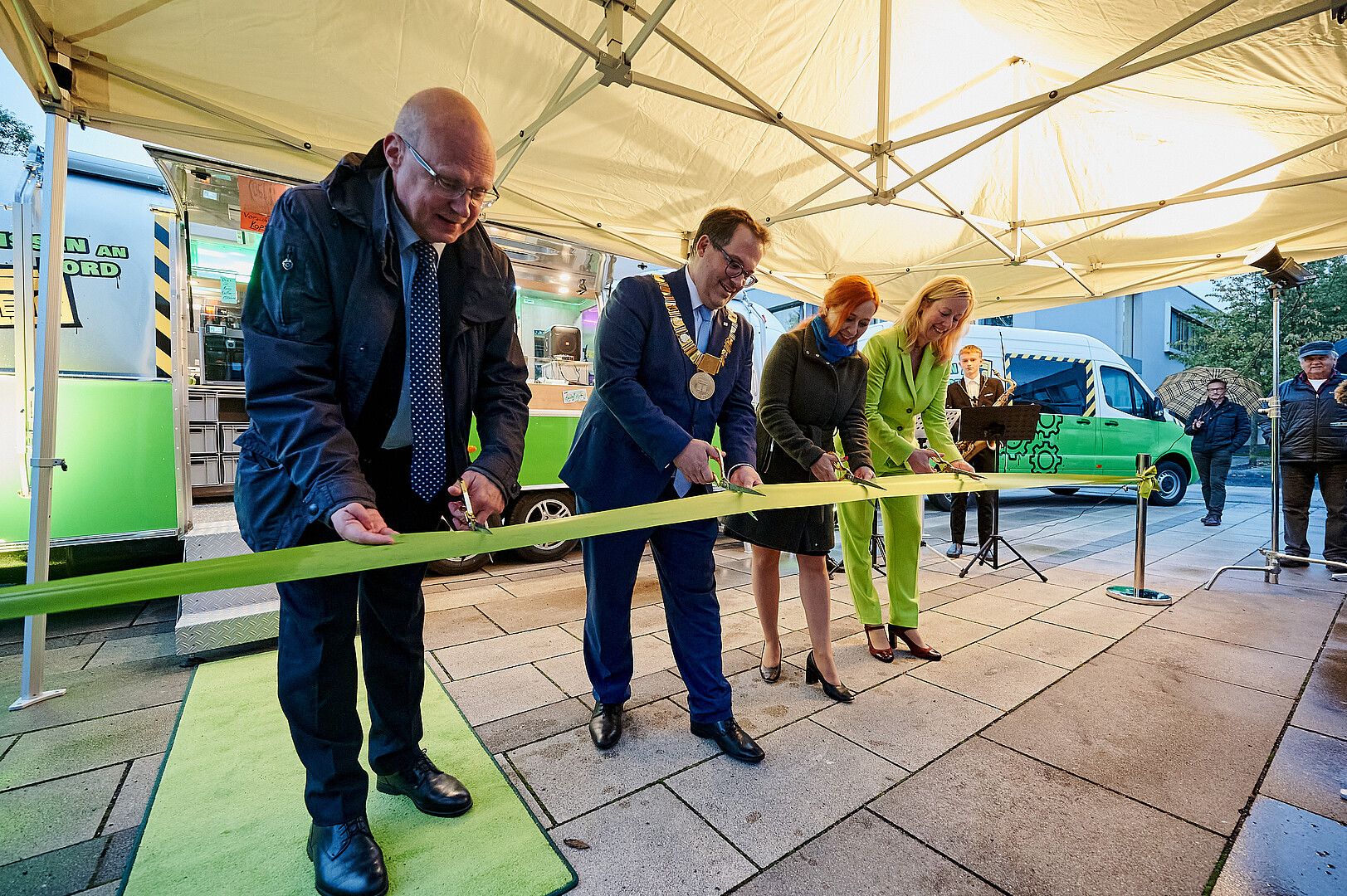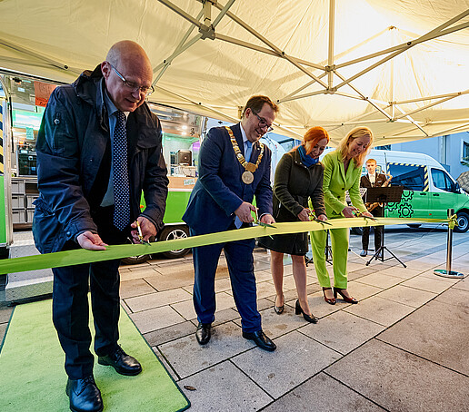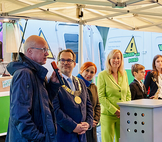 Mit goldenen Scheren vollzogen der Rektor, Professor Alexander Kratzsch, und die Prorektorin für Bildung und Internationales, Professorin Sophia Keil, gemeinsam mit der Landtagsabgeordneten Franziska Schubert (Bündnis 90/Die Grünen) und dem Vorsitzenden des Hochschulrates der HSZG, Professor Welf-Guntram Drossel, den symbolischen Akt des Banddurchschnittes. In ihren Grußworten würdigten sie die Bedeutung des mobilen Lernortes für die außerschulische MINT-Bildung in der Region und für die Hochschule.