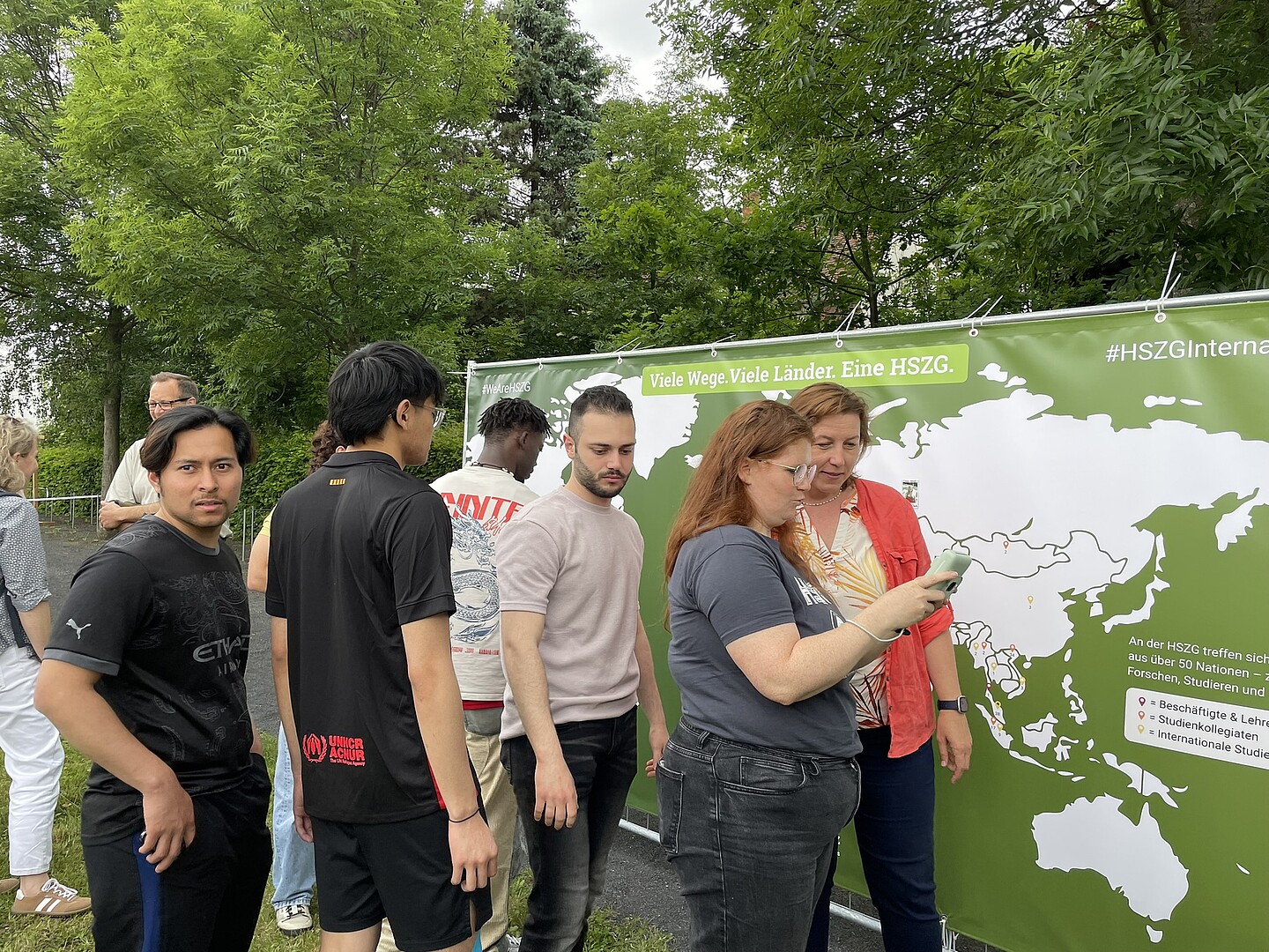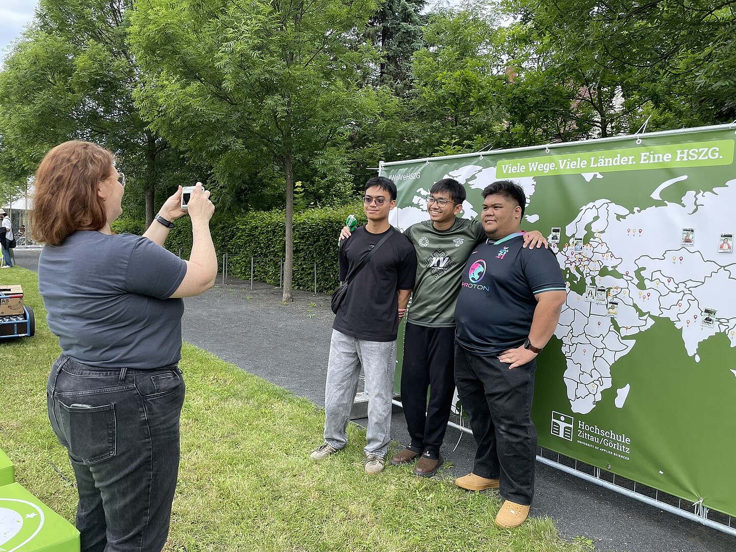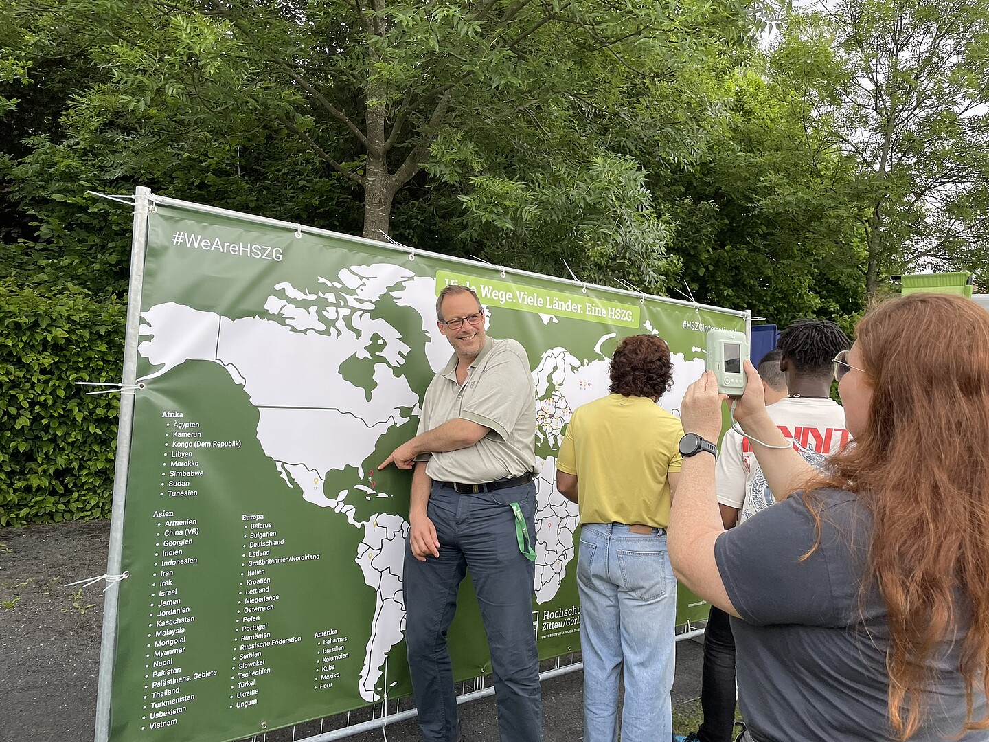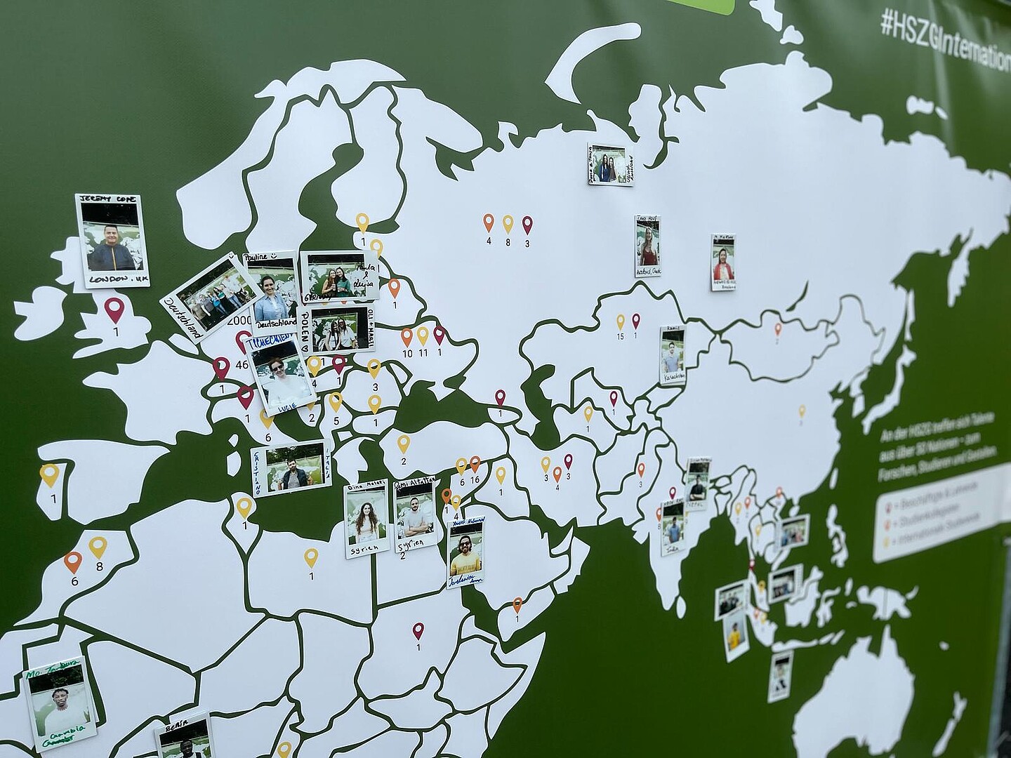 Über 50 Nationen sind an unserer Hochschule vertreten – unter den Studienkollegiaten, Studierenden und Mitarbeitenden. Diese Vielfalt wurde auf dem Campus eindrucksvoll in Szene gesetzt. Eine große Weltkarte zeigte die Herkunftsländer der Hochschulangehörigen. Im Laufe des Tages füllte sie sich mit Fotos aus einer Sofortbildkamera: Menschen zeigten, woher sie stammen – und machten so die Internationalität der HSZG auf ganz persönliche Weise sichtbar.