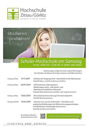 Die „Schüler-Hochschule am Samstag“ bietet Neunt- bis Zwölftklässlern Gelegenheit, einen Blick in eine mögliche Zukunft an der HSZG zu werfen und sich ganz wie ein Student zu fühlen. In Hörsälen, Seminarräumen und Laboren erhalten Sie Einblicke in Theorie und Praxis, Studieninhalte und Studienalltag gleichermaßen. Jeder der vier Veranstaltungstermine im Studienjahr 2017/18 wird von einer anderen Fakultät gestaltet und steht unter einem anderen Thema.