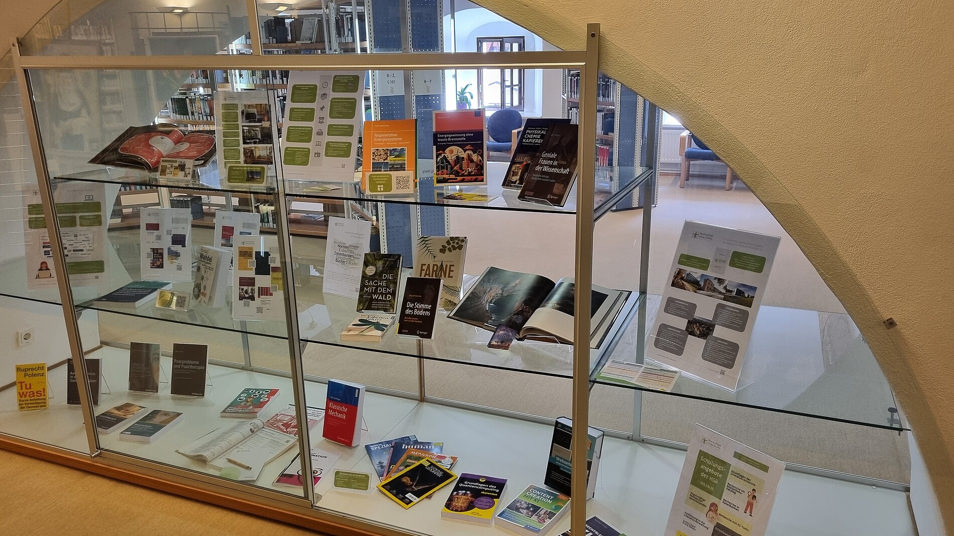 Ab sofort können sich Besucher der Christian-Weise-Bibliothek in Zittau auch über das Angebot der Hochschulbibliothek informieren. In einer Ausstellungsvitrine werden nicht nur zahlreiche Informationen zur Benutzung der Hochschulbibliothek, zum Angebot an elektronischen Medien und zu Rechercheschulungen präsentiert, sondern auch einige Medien ausgestellt, die zum Bestand der Hochschulbibliotheken in Zittau und Görlitz gehören. Die HSB als öffentliche wissenschaftliche Fachbibliothek ergänzt das umfangreiche Angebot städtischer Bibliotheken und bietet zudem Lernräume für Recherche, Studium oder Job.