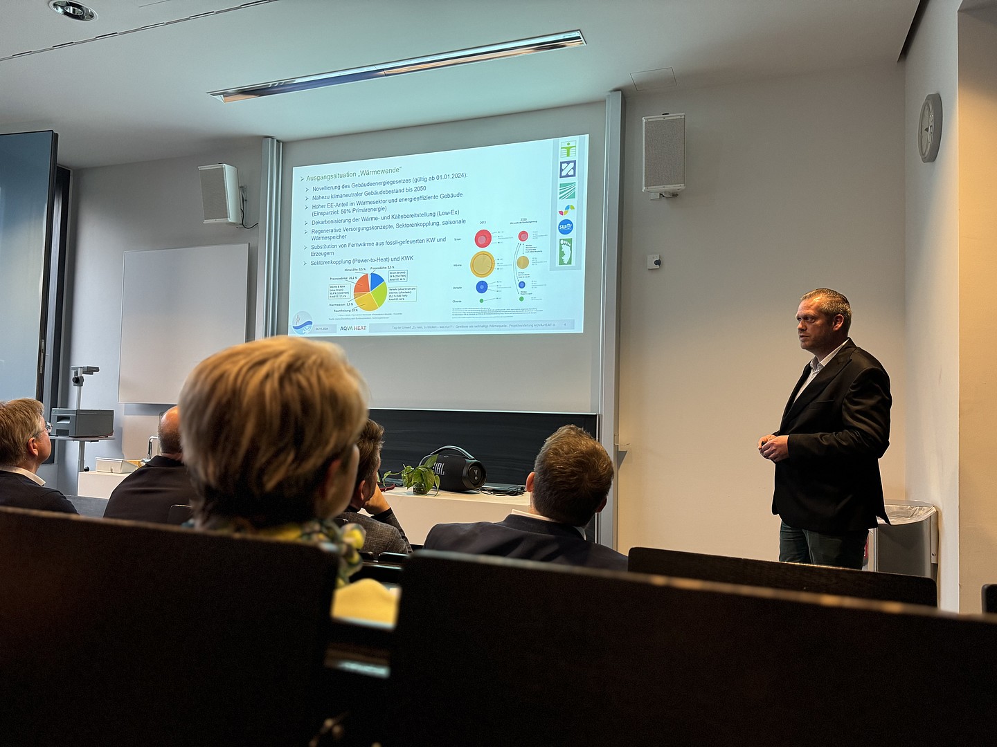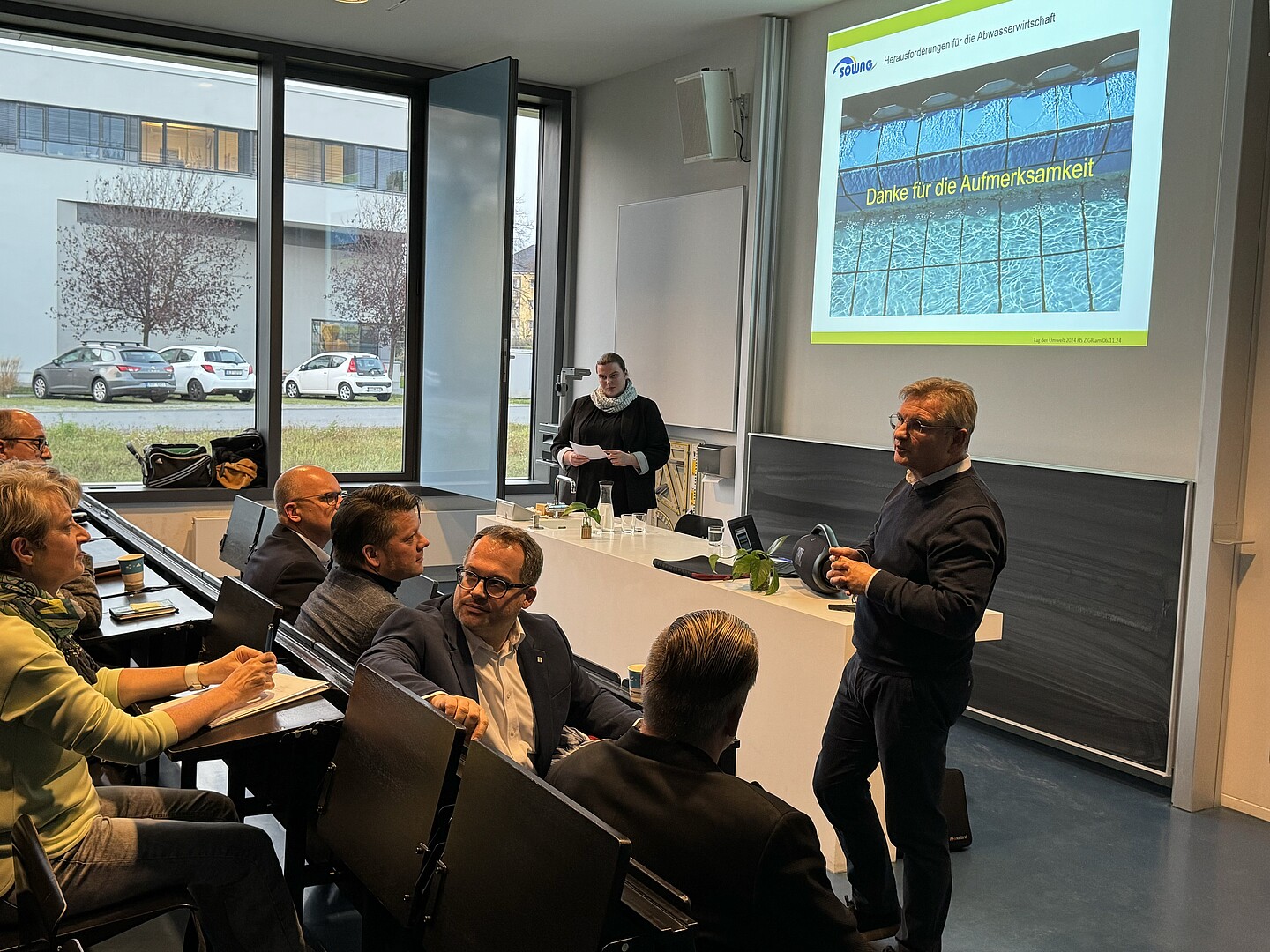 Es folgten mehrere Fachvorträge. Juliane Dziumla, Associate Sustainability Officer der United Nations University, eröffnete die Vortragsreihe mit ihrem Beitrag zu den globalen Zielen und der lokalen Verantwortung im Zusammenhang mit Klimawandel und nachhaltiger Entwicklung. Im Anschluss erläuterte Rocco Deckert, technischer Geschäftsführer der Stadtwerke Zittau, die Herausforderungen der Wasserversorgung in Zittau und stellte das Projekt „Z-Aqua: Stabilität und Resilienz – Zittauer Trinkwasser als Generationenaufgabe“ vor. Michael Kuba, Geschäftsführer der SOWAG sprach über die Herausforderungen in der Abwasserwirtschaft und die notwendigen Anpassungen an den Klimawandel. Thomas Gubsch, Projektmitarbeiter des AQVA-HEAT-Projekts an der Hochschule Zittau/Görlitz schloss die Runde mit der Vorstellung des innovativen Projektes zur Nutzung von Gewässern als nachhaltige Wärmequelle.
