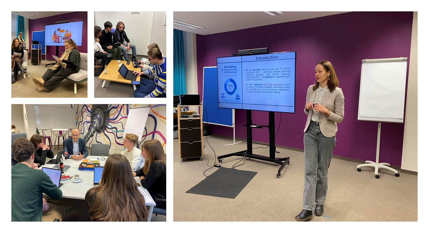 Den Einstieg gestalteten Falk Maiwald und Sebastian Benad mit Teambuilding-Formaten wie Interviews, Mission Pitches und Gruppenaufgaben. Fachliche Impulse zur Künstlichen Intelligenz im Recruiting kamen von Mgr. Anastasiia Mazurchenko, Ph.D., Assistent Professor, TU Liberec, ergänzt durch Studierendenbeiträge zum Recruiting-Prozess und zur Personalauswahl von Magdalena, Lilly, Pia und Kim. Die Impulse gaben eine Richtung vor – den Weg entwickelten die Teams selbst.