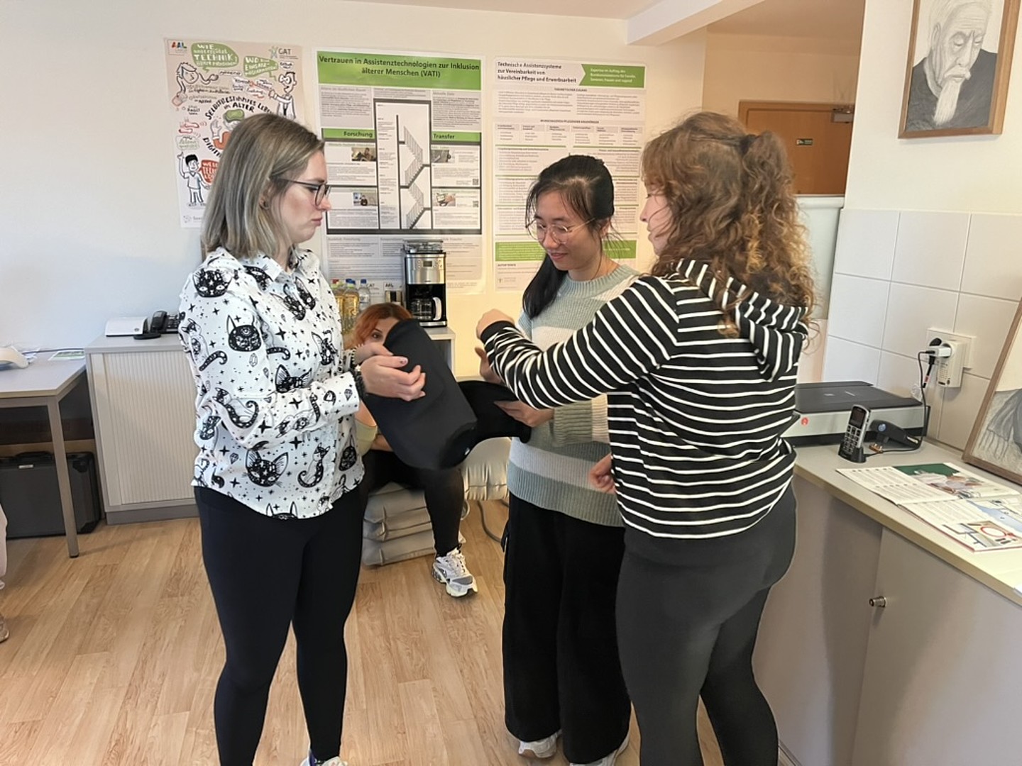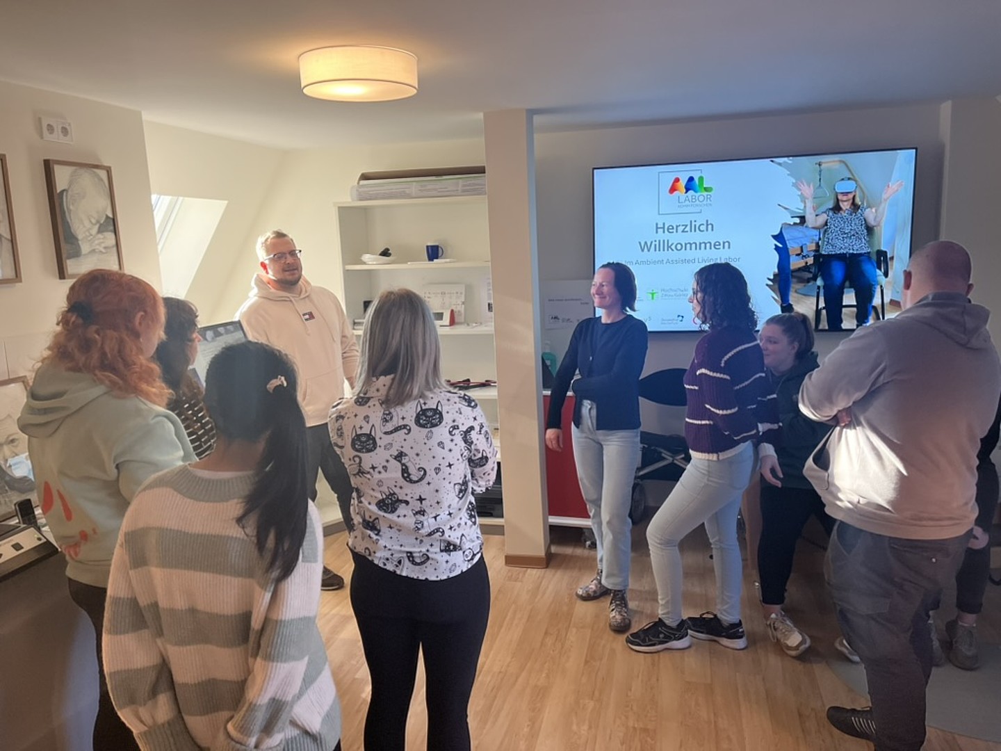 Während des Besuchs erkundete die Klasse die Musterwohnung des AAL-Labors, in der eine Vielzahl von technischen Hilfsmitteln vorgestellt wurde. Einige dieser Hilfsmittel waren den Auszubildenden bereits aus ihrer bisherigen Praxis bekannt, während andere völlig neu für sie waren. Besonders wertvoll war die Gelegenheit, die Technik gemeinsam auszuprobieren und sich über eigene Praxiserfahrungen auszutauschen.