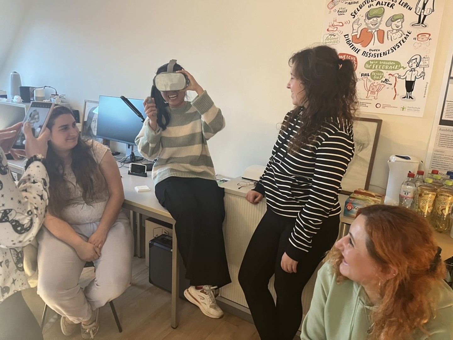 Ein besonderes Highlight des Besuchs stellte die VR-Brille dar, die innovative Möglichkeiten für Schulungen und Simulationen in der Pflege eröffnet. Ebenso erregte die smarte Medikamentenbox großes Interesse, die für mehr Sicherheit bei der Medikamenteneinnahme sorgt. Beide Technologien wurden intensiv diskutiert und regten zum Nachdenken über ihren Nutzen in der Praxis an.