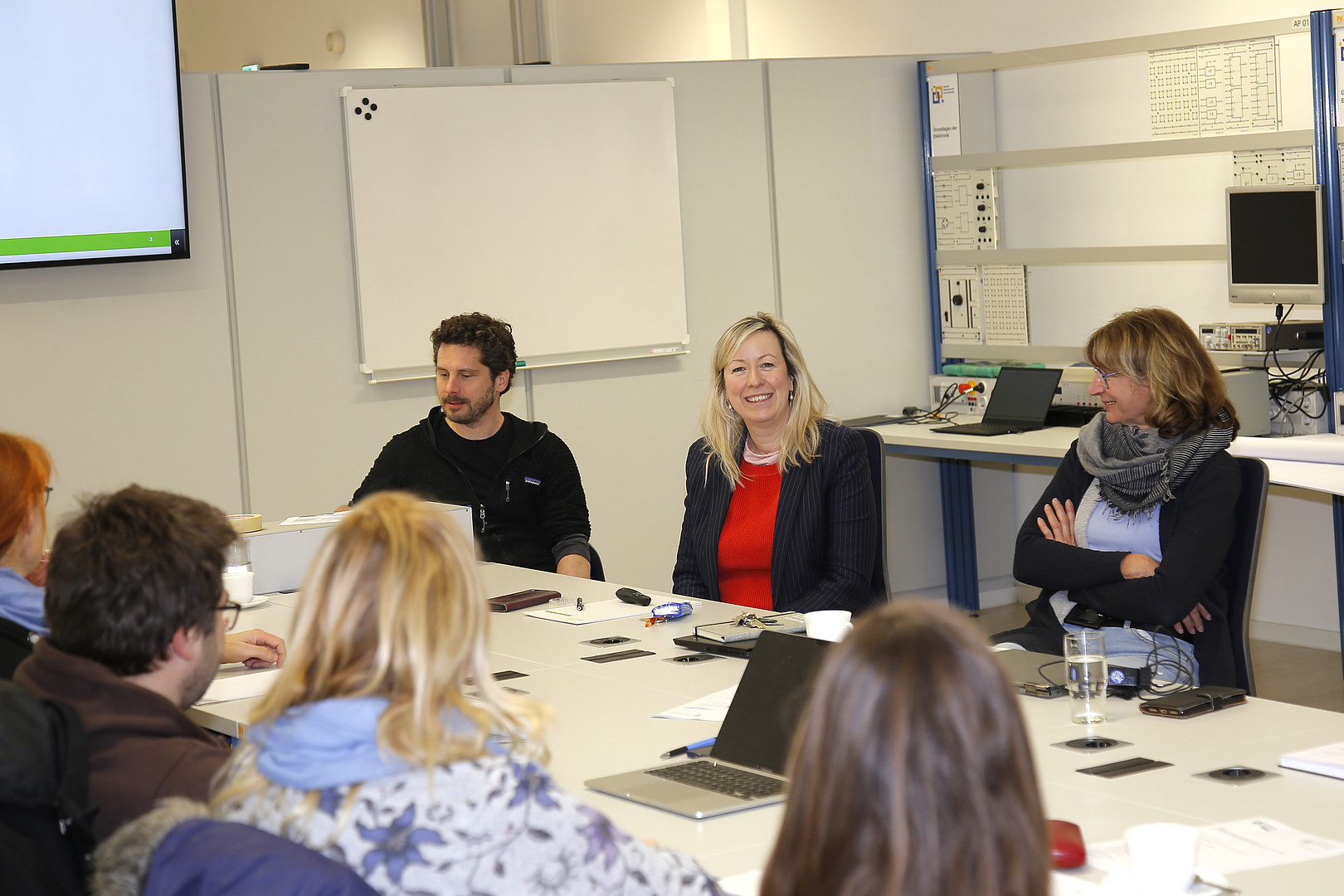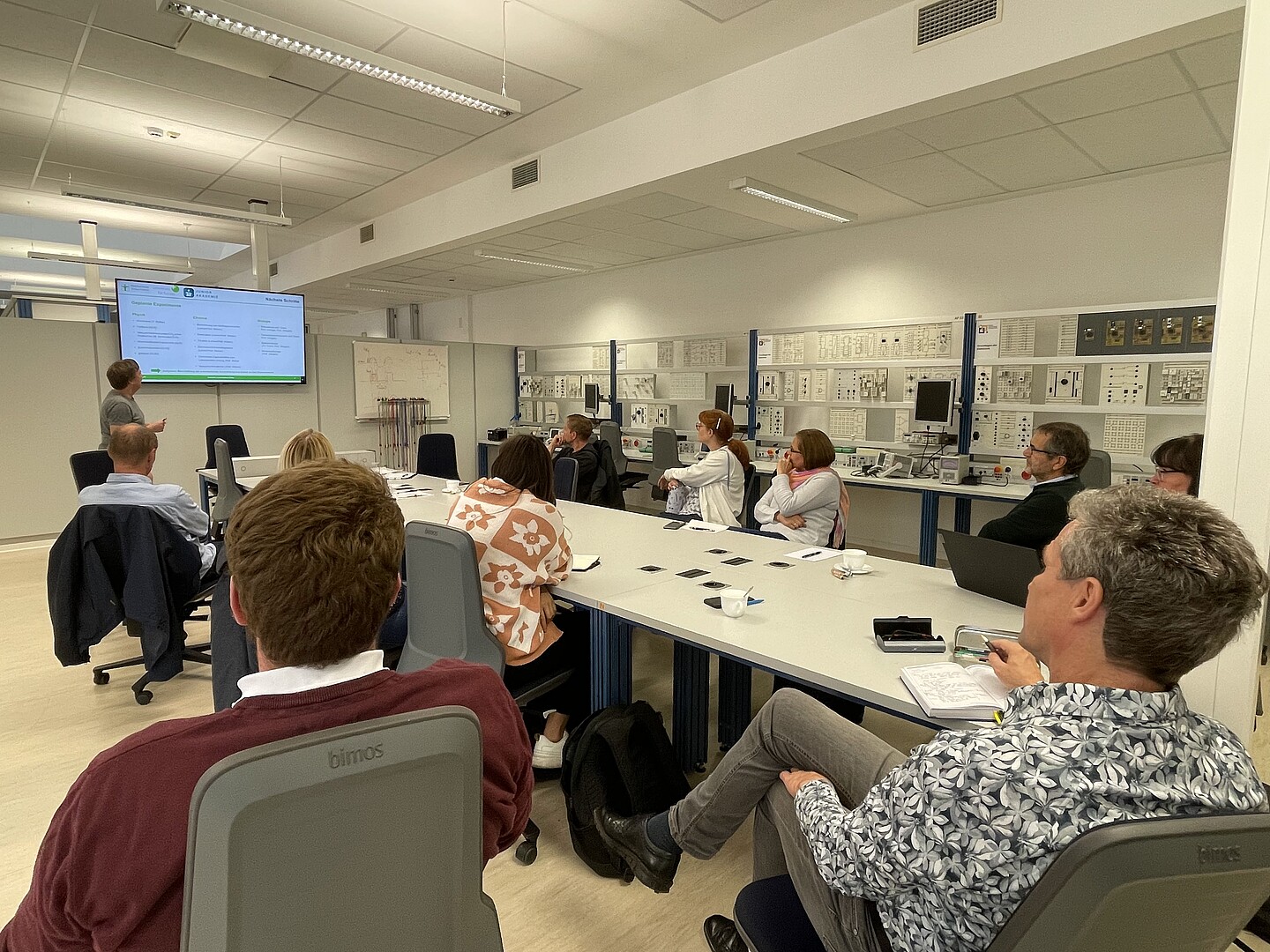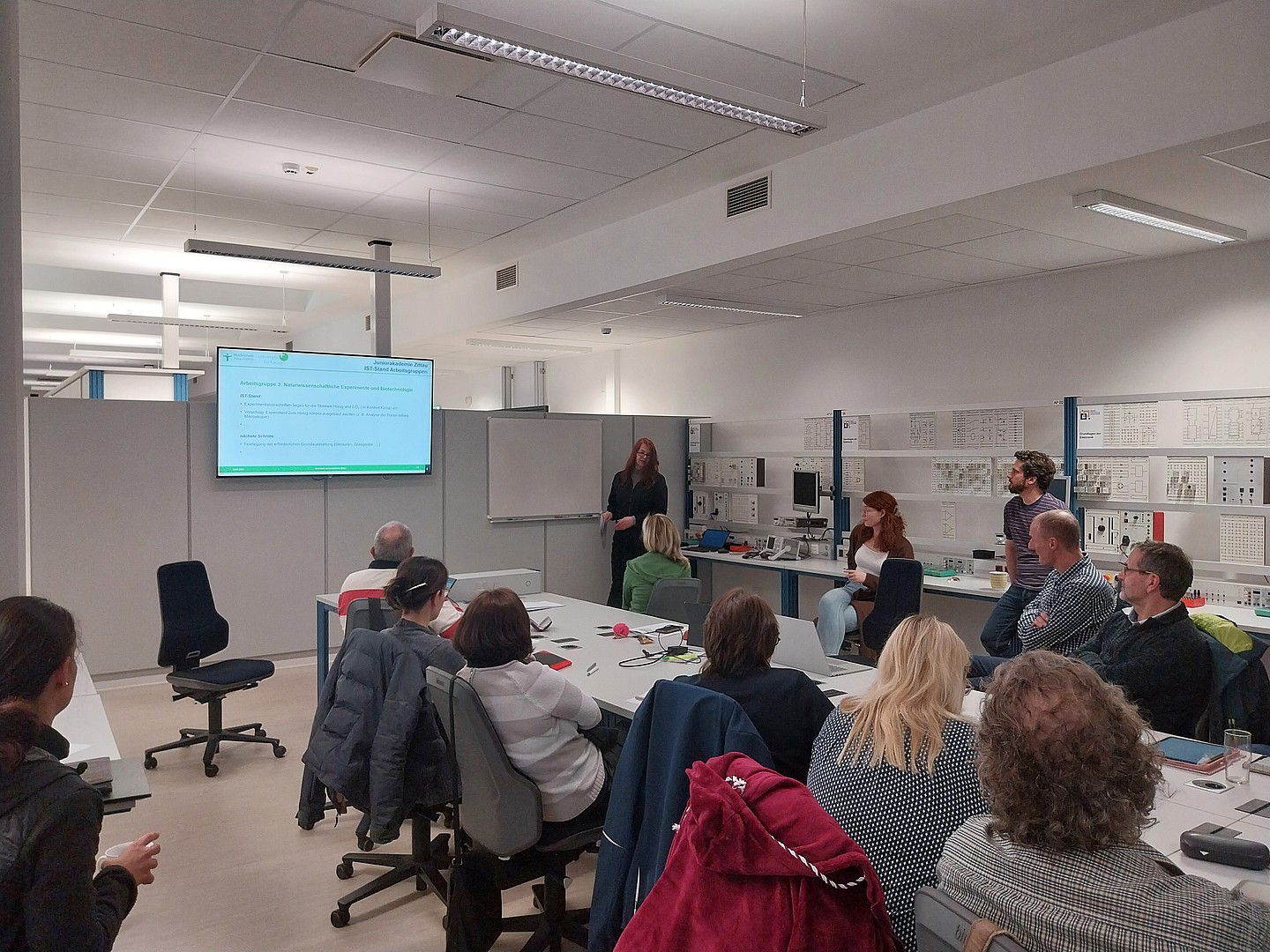 Beim dritten Treffen der Werkstatt berichtete Herr Riedel vom ZukLOS-Team über den Besuch des DLR_School_Lab Berlin, das Professorin Keil und ihre Kollegen gemeinsam erkundet hatten. Der Besuch zielte darauf ab, die Experimente vor Ort kennenzulernen, die Durchführung der Experimente mit einer Schulklasse zu begleiten und die nächsten Schritte für den Aufbau des DLR_School_Lab Hochschule Zittau/Görlitz zu besprechen. Anschließend wurden fünf Arbeitsgruppen zu verschiedenen thematischen Schwerpunkten (z. B. Naturfasern, Wärmepumpe, naturwissenschaftliche Experimente und Biotechnologie) gebildet, um Experimente mit Bezug zu den Sächsischen Lehrplänen zu entwickeln.