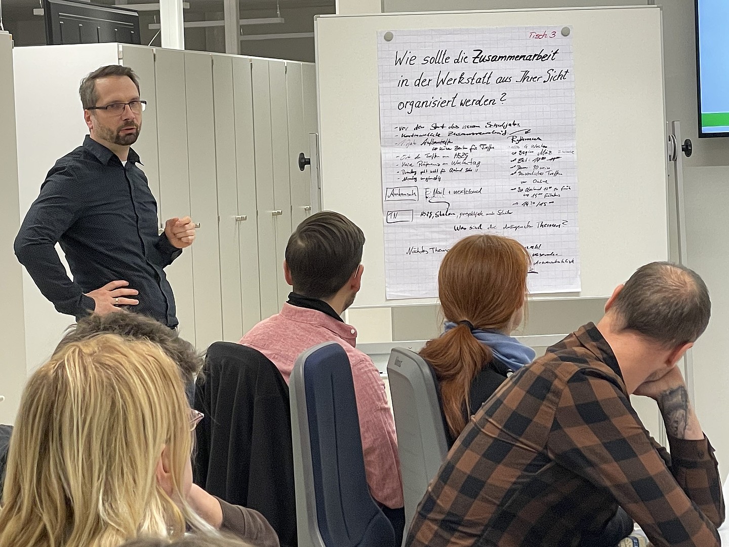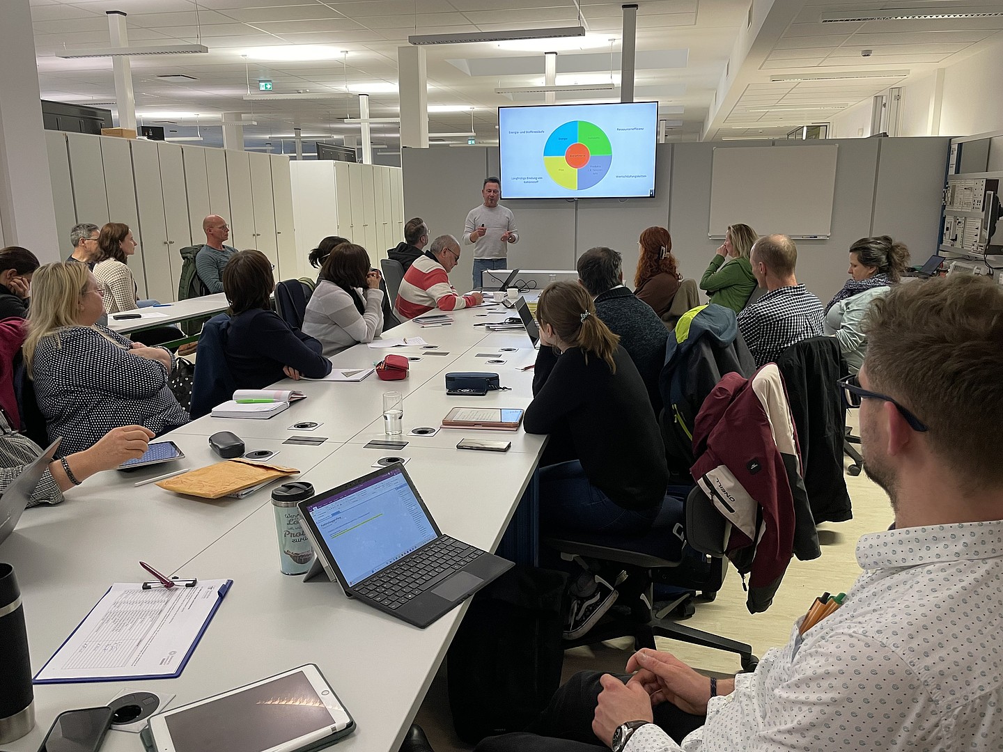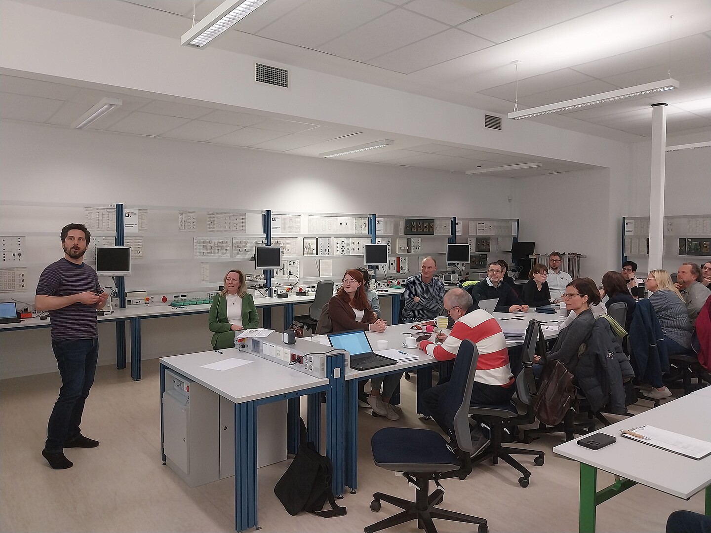 Beim dritten Treffen der Werkstatt berichtete Herr Riedel vom ZukLOS-Team über den Besuch des DLR_School_Lab Berlin, das Professorin Keil und ihre Kollegen gemeinsam erkundet hatten. Der Besuch zielte darauf ab, die Experimente vor Ort kennenzulernen, die Durchführung der Experimente mit einer Schulklasse zu begleiten und die nächsten Schritte für den Aufbau des DLR_School_Lab Hochschule Zittau/Görlitz zu besprechen. Anschließend wurden fünf Arbeitsgruppen zu verschiedenen thematischen Schwerpunkten (z. B. Naturfasern, Wärmepumpe, naturwissenschaftliche Experimente und Biotechnologie) gebildet, um Experimente mit Bezug zu den Sächsischen Lehrplänen zu entwickeln.
