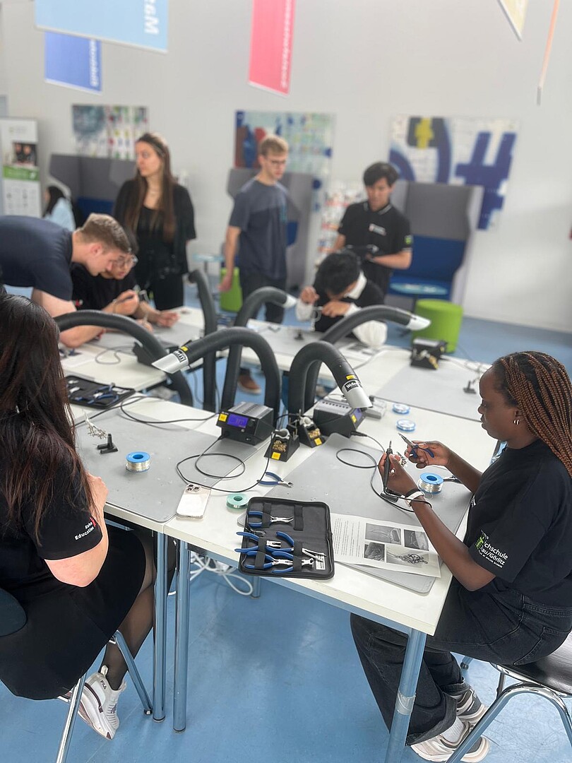 Die Teilnehmenden konnten bei verschiedenen Workshops selbst aktiv werden. Sie bedruckten T-Shirts mit Hochschulmotiven, löteten Schmuck, arbeiteten im AirLab mit 3D-Druckern und Lasercuttern – so konnten alle Studieninteressierten kreativ sein und erste Kontakte zur Hochschule knüpfen.
