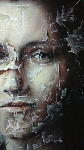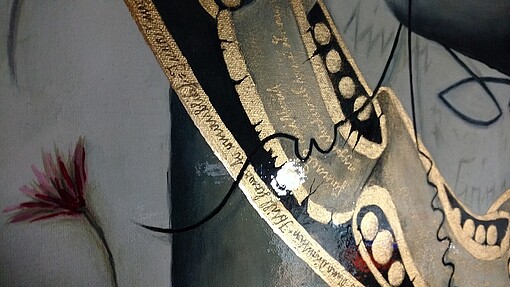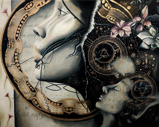 Als alleinerziehende Mutter und vollzeit tätig, findet Ramona Böhme nur abends Zeit zu arbeiten. Ölfarben, Metalpigmentfarbe, Blattgold, -silber und -kupfer sind dabei ihre bevorzugten Materialen.
